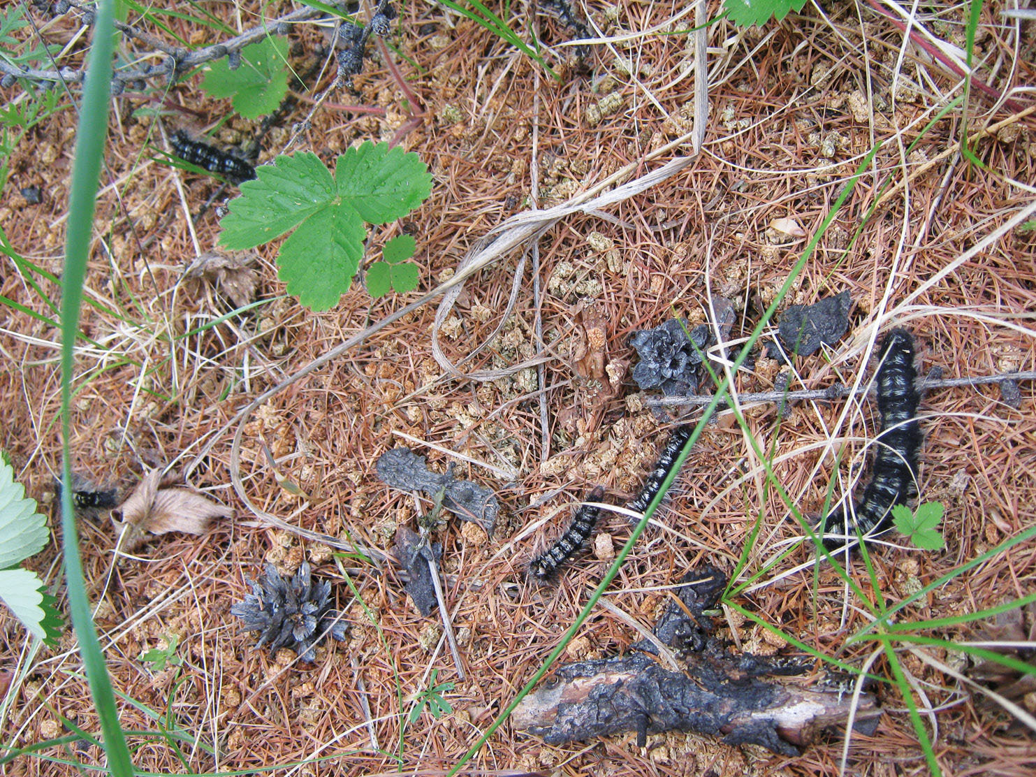 Рис. 1. Перезимовавшие гусеницы сибирского коконопряда Dendrolimus sibiricus VI (справа) и IV возрастов (в центре и слева) на поверхности почвы в центрально-якутском очаге. О степени поражения древостоя можно судить по количеству прошлогодних экскрементов вредителя (светлые гранулы), покрывающих лесную подстилку (фото А. П. Бурнашевой).