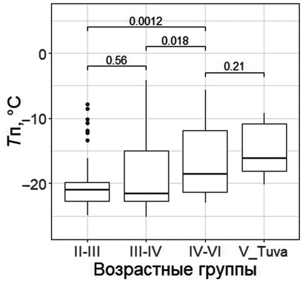 Статистический анализ проводился стандартными методами с использованием программ Statistica 10 для Windows и R (версия 4.3.1, R Core Team, 2023). Нормальность распределений ТП определяли, используя тест Шапиро–Уилка, сравнение их средних значений в возрастных группах – тестом Крускала–Уоллеса с последующим попарным сопоставлением. Зависимость между тестированными длительно переносимыми температурами и выживанием гусениц оценивали, исходя из величины коэффициента корреляции Спирмена (rS). Значения в тексте представлены как среднее ± стандартная ошибка; значимости различий принята от p ≤ 0.05.