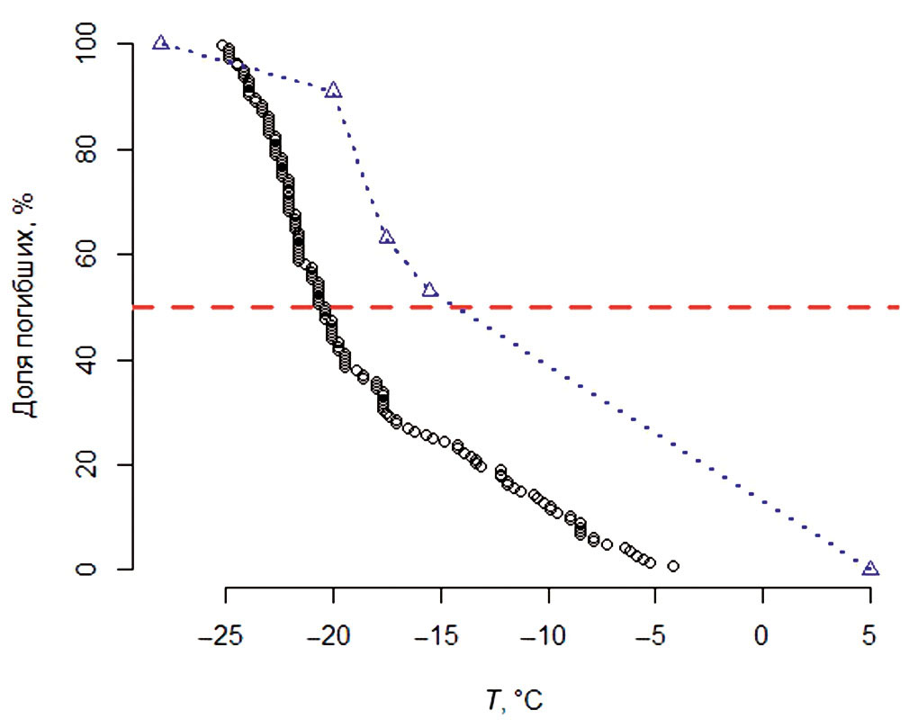 До настоящего времени существовала лишь одна, предпринятая более 60 лет назад, попытка оценить устойчивость D. sibiricus к зимним условиям (Коломиец, 1961). На небольшой выборке гусениц старшего возраста лиственничной расы из тувинской популяции была измерена единственная характеристика холодостойкости – температура максимального переохлаждения (ТП), позволяющая судить лишь о минимальных кратковременно переносимых температурах. Коломиец (1961) выявил снижение ТП гусениц от начала зимы (–10.2 ± 0.4°C) к ее середине (–14.9 ± 1.5°C) и непереносимость замораживания. Хотя в указанной работе не изучалась способность коконопряда длительно выживать при низких отрицательных температурах, был сделан вывод, что его гусеницы очень устойчивы к холоду и подавляющее большинство особей хорошо переносят температуру –20°C (Коломиец, 1961, 1962, 1987; Рожков, 1965).