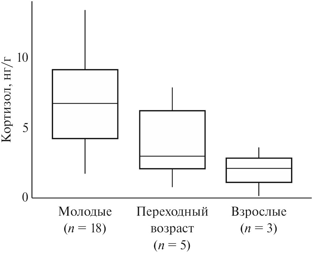 Возрастные различия. Для оценки возрастных различий использовали выборку 2021 г. (18 молодых, 5 нерп переходного возраста, 3 взрослые нерпы). Были обнаружены различия в концентрации кортизола в волосах между молодыми нерпами и выборкой взрослых особей и нерп переходного возраста – у молодых концентрация кортизола оказалась достоверно выше по сравнению с этим показателем у более взрослых нерп (W = 27, p = 0.01). Значения концентраций кортизола в волосах нерп переходного возраста занимают промежуточное положение между таковыми у молодых и взрослых нерп (рис. 3).