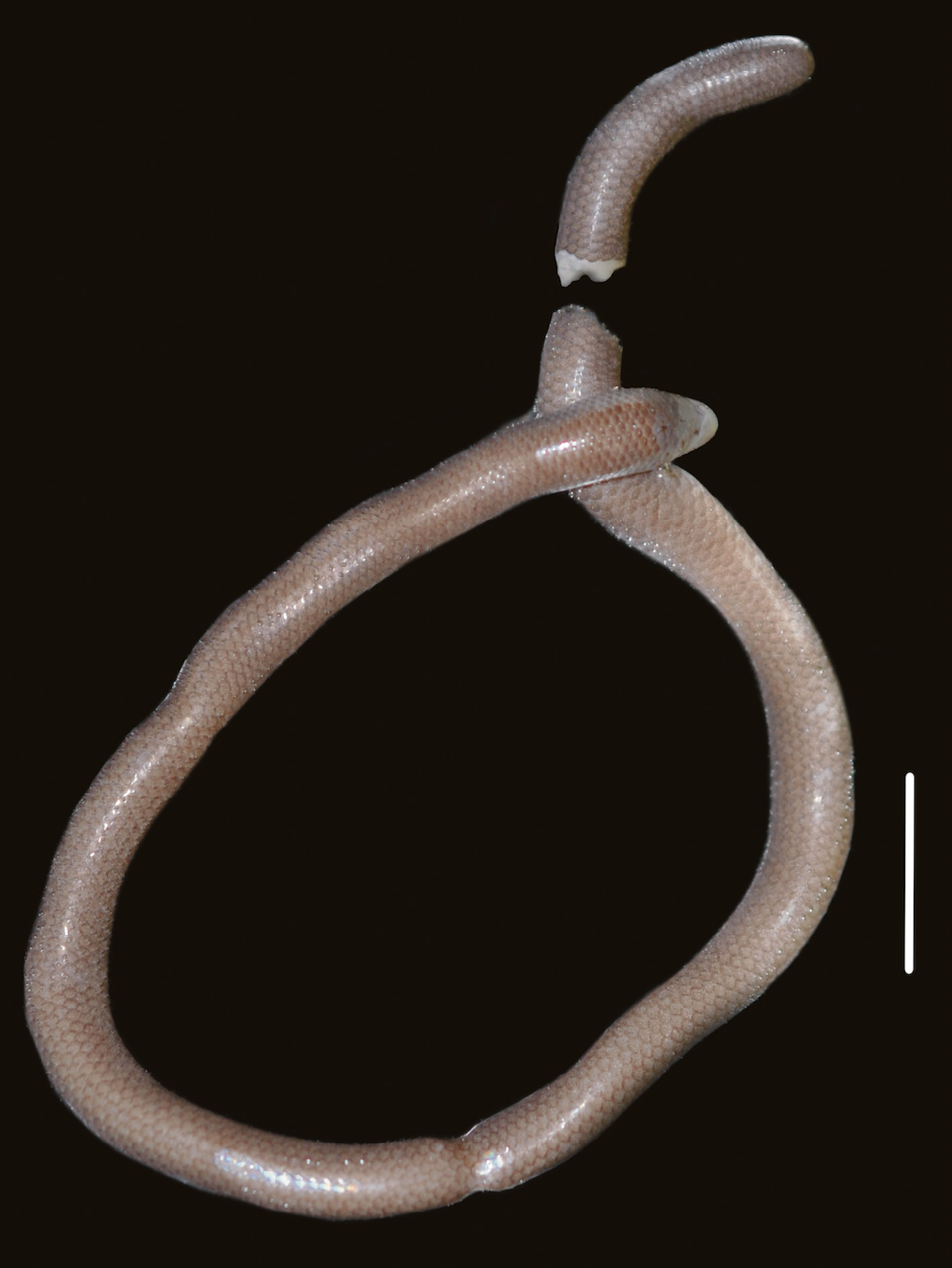 Изменчивость. Промеры и значения меристических признаков типовой серии приведены в табл. 3. Голотип ZMMU Re-17894 (самец) по признакам фолидоза и пропорциям тела схож с паратипами CBC03114 (самец), а также с ZMMU Re-17895, CBC02961 и CBC03113 (самки). Самцы отличаются наличием рудиментарных ластообразных задних конечностей, что является характерным проявлением полового диморфизма у всех представителей семейства Dibamidae (Greer, 1985; Neang et al., 2011; Quah et al., 2017; Koppetsch et al., 2019). Относительно небольшая длина хвоста у голотипа (ZMMU Re-17894, TL/SVL 16.9%), вероятно, объясняется тем, что часть органа была отброшена в результате аутотомии; относительная длина хвоста у паратипов несколько больше (TL/SVL 20.7–22.0%). Паратип ZMMU Re-17895 (самка) отличается от голотипа меньшим, а паратип CBC02961 (самка) – бòльшим числом рядов поперечных чешуй перед клоакой (17 и 19 против 18 у ZMMU Re-17894, соответственно). Все исследованные паратипы отличаются от голотипа бòльшим числом брюшных чешуй (183–202 против 178 у ZMMU Re-17894) и бòльшим числом подхвостовых чешуй (47–52 против 46 у ZMMU Re-17894) (табл. 3). У самца CBC03114, а также самок CBC02961 и CBC03113 на середине туловища имеется светло-серая поперечная полоса шириной примерно в семь спинных чешуек; у голотипа и паратипа ZMMU Re-17895 экземпляров такая полоса отсутствует.