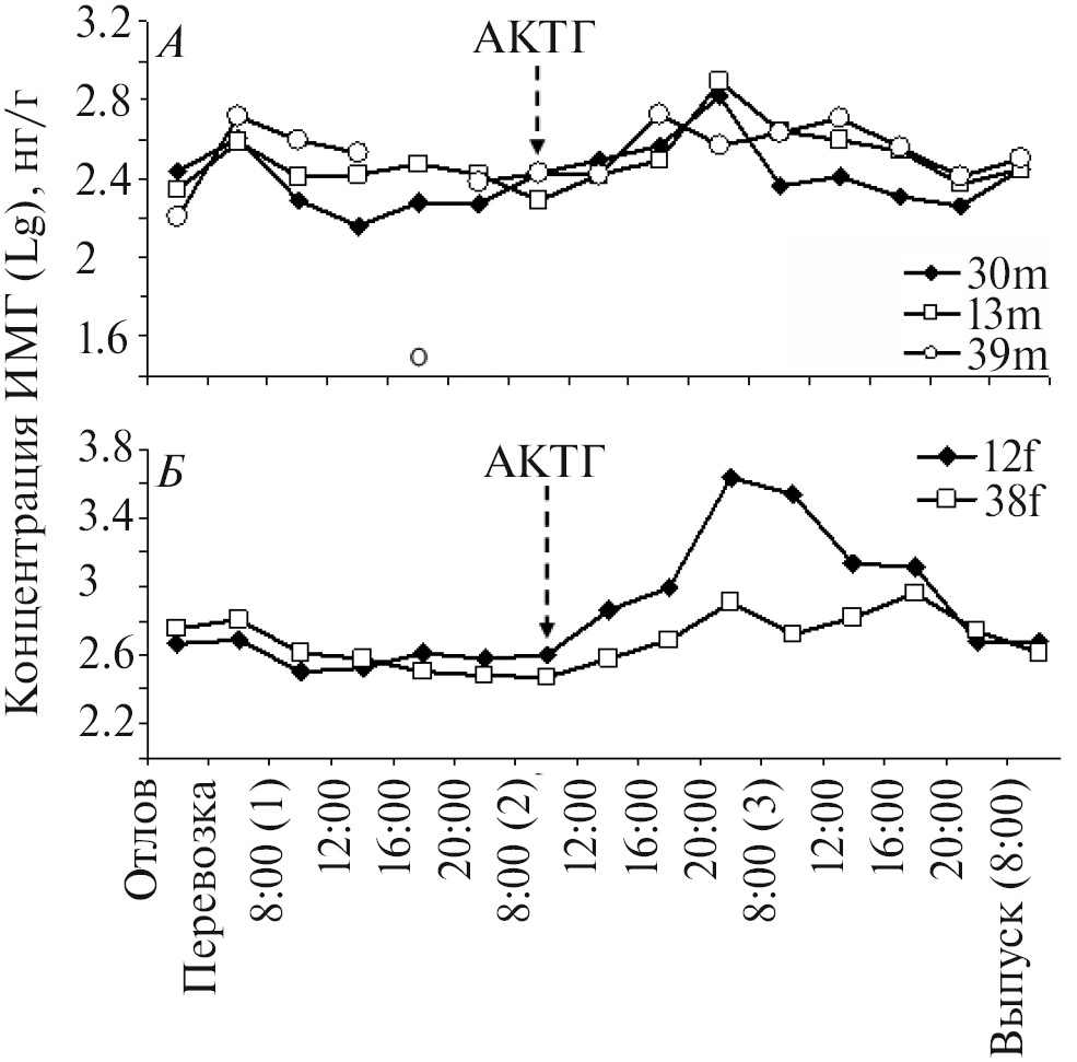 Суточный ритм. Контроль уровня ИМГ у трех самцов и двух самок, содержавшихся в индивидуальных клетках 05–07.07.2023 до инъекции АКТГ, показал отсутствие у этих особей сколько-нибудь выраженной суточной вариации уровня ИМГ (рис. 2А, 2Б).
