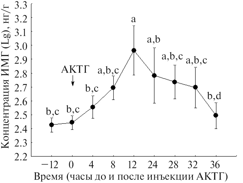 Отметим также, что на протяжении суток до инъекции АКТГ значимые изменения в уровне ИМГ отсутствовали (F4, 16 = 0.7, p = 0.61). Подъем уровня ИМГ произошел именно в ответ на АКТГ и не был связан с вероятным суточным ритмом, поскольку в те же часы накануне инъекции повышения уровня ИМГ не было.
