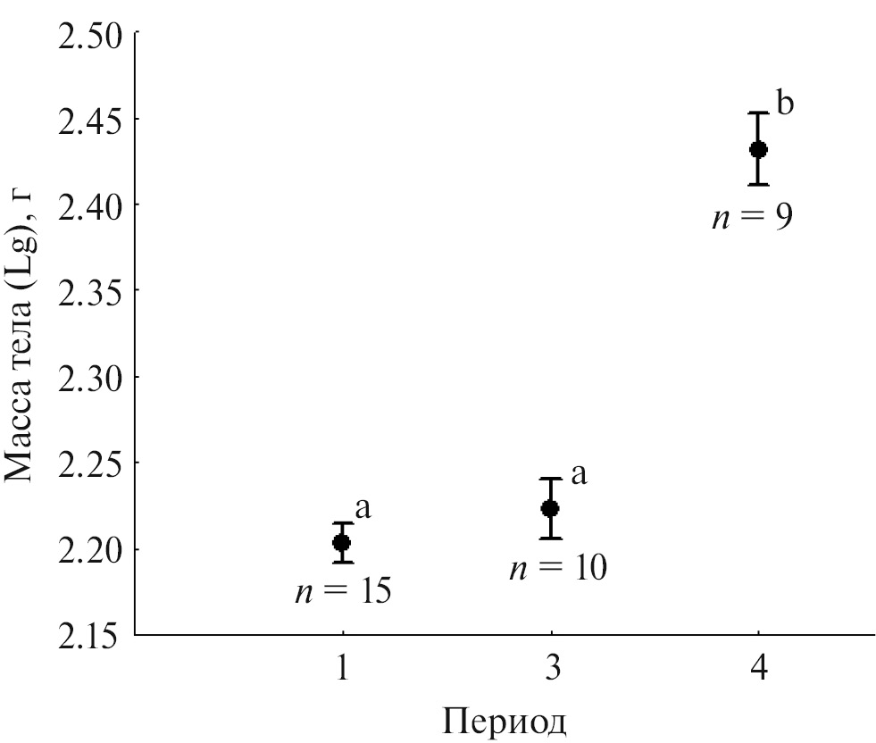 Рис 4. Масса тела сеголетков крапчатых сусликов (среднее ± ошибка), отловленных в донорской популяции (1), через трое суток после перевозки и выпуска (3) и перед залеганием в спячку (4). Результат использования смешанной линейной модели (Mixed General Linear Model) с номером особи в качестве случайного фактора (random effect) и этапа в качестве категориального фиксированного фактора (fixed effect). Одинаковые латинские буквы показывают отсутствие значимых различий (p > 0.05, тест Тьюки); n – размер выборки.