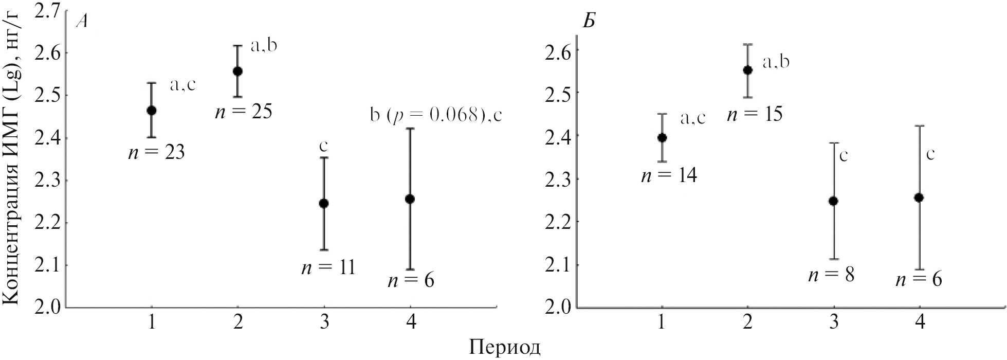 Рис 5. Уровень ИМГ (среднее ± ошибка) на разных этапах эксперимента у крапчатых сусликов, изъятых из донорской популяции: А – все особи (F3, 32 = 4.1, p = 0.014), Б – сеголетки (F3, 21 = 6.3, p = 0.003). 1 – сразу после отлова (фоновый уровень стрессированности), 2 – после перевозки, 3 – через трое суток после выпуска в вольеру, 4 – перед залеганием в спячку. Приведен результат использования смешанной линейной модели (Mixed General Linear Model) с номером особи в качестве случайного фактора (random factor) и этапа в качестве категориального фиксированного фактора (fixed effect). Одинаковые латинские буквы показывают отсутствие значимых различий (p > 0.05, тест Тьюки); n – размер выборки.