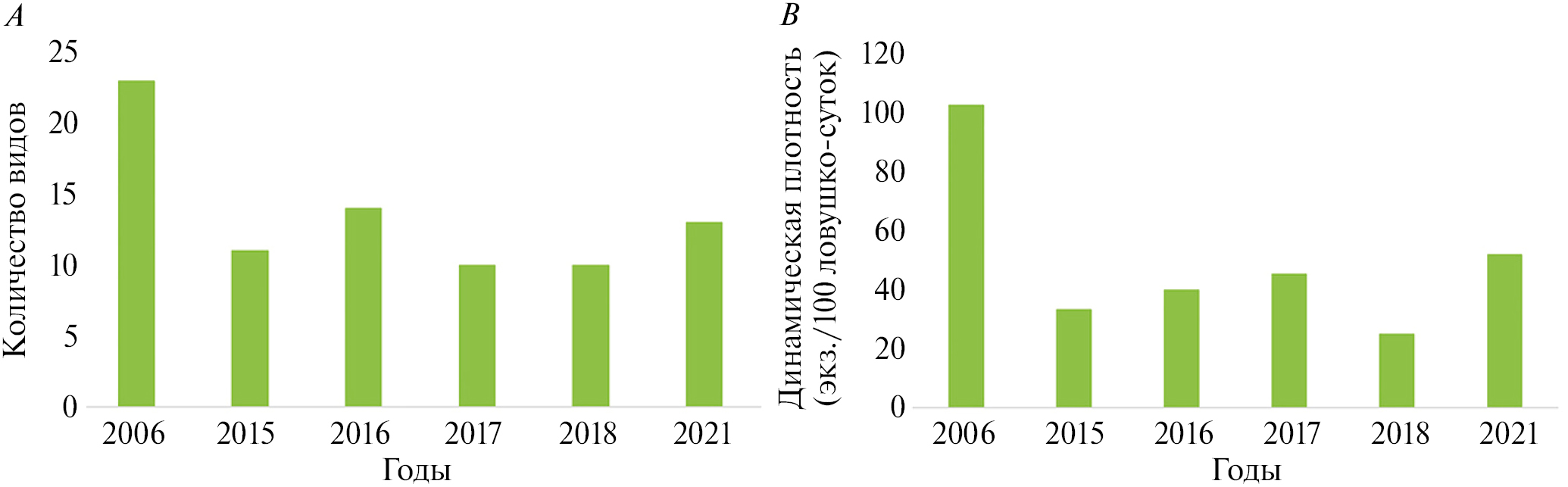 Рис. 1. Количество видов (A) и динамическая плотность (B) двупарноногих многоножек в разные годы.