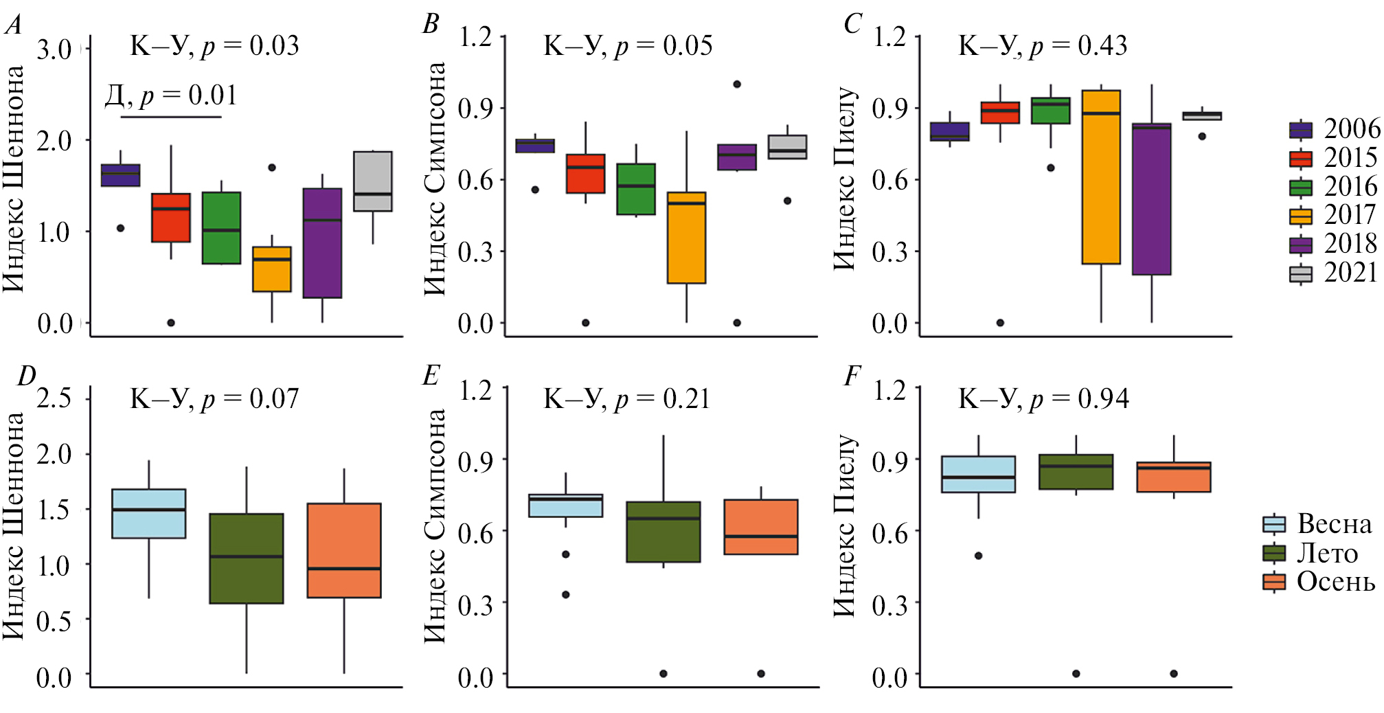 Рис. 2. Показатели альфа-разнообразия диплопод. A и D – показатели индекса разнообразия Шеннона, B и E – индекса разнообразия Симпсона, C и F – индекса выравненности экологических сообществ. Для сравнения индексов альфа-разнообразия между годами (A, B, C) и временами года (D, E, F) был использован критерий Краскела–Уоллиса (К–У) с последующим попарным сравнением с применением критерия Даннета (Д). Статистически значимые различия (p < 0.5) по результатам попарного сравнения отображены линиями между сравниваемыми группами. Поправка на множественную проверку гипотез выполнена с использованием критерия Беньямини–Хохберга.