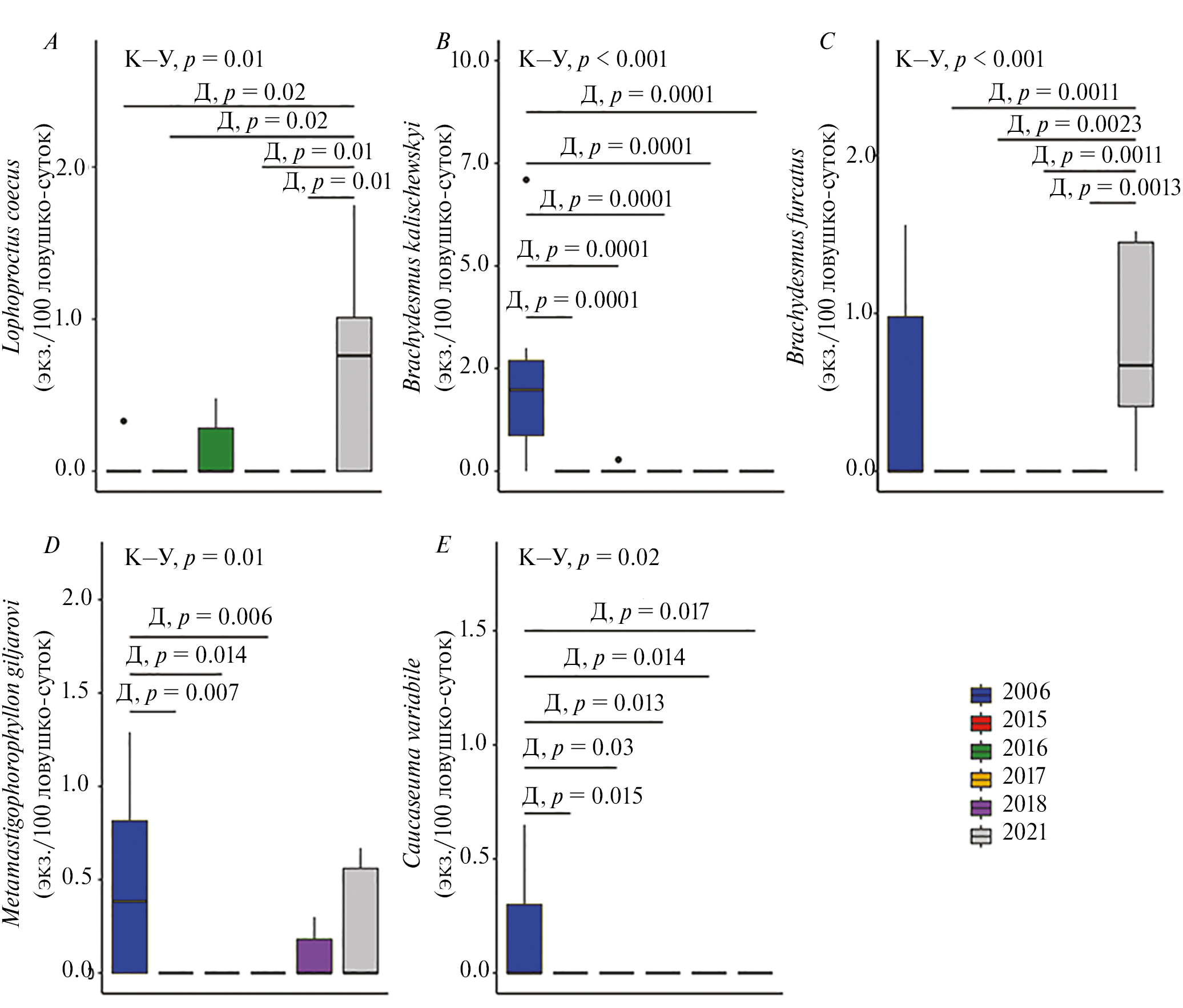 Рис. 4. Результаты анализа изобилия диплопод на ранге вида. A–E – статистически значимые изменения обилия видов диплопод между анализируемыми годами. Для сравнения показателей использован критерий Краскела–Уоллиса (К–У) с последующим попарным сравнением с применением критерия Даннета (Д). Статистически значимые различия (p < 0.5) по результатам попарного сравнения отображены линиями между сравниваемыми группами. Поправка на множественную проверку гипотез выполнена с использованием критерия Беньямини–Хохберга.
