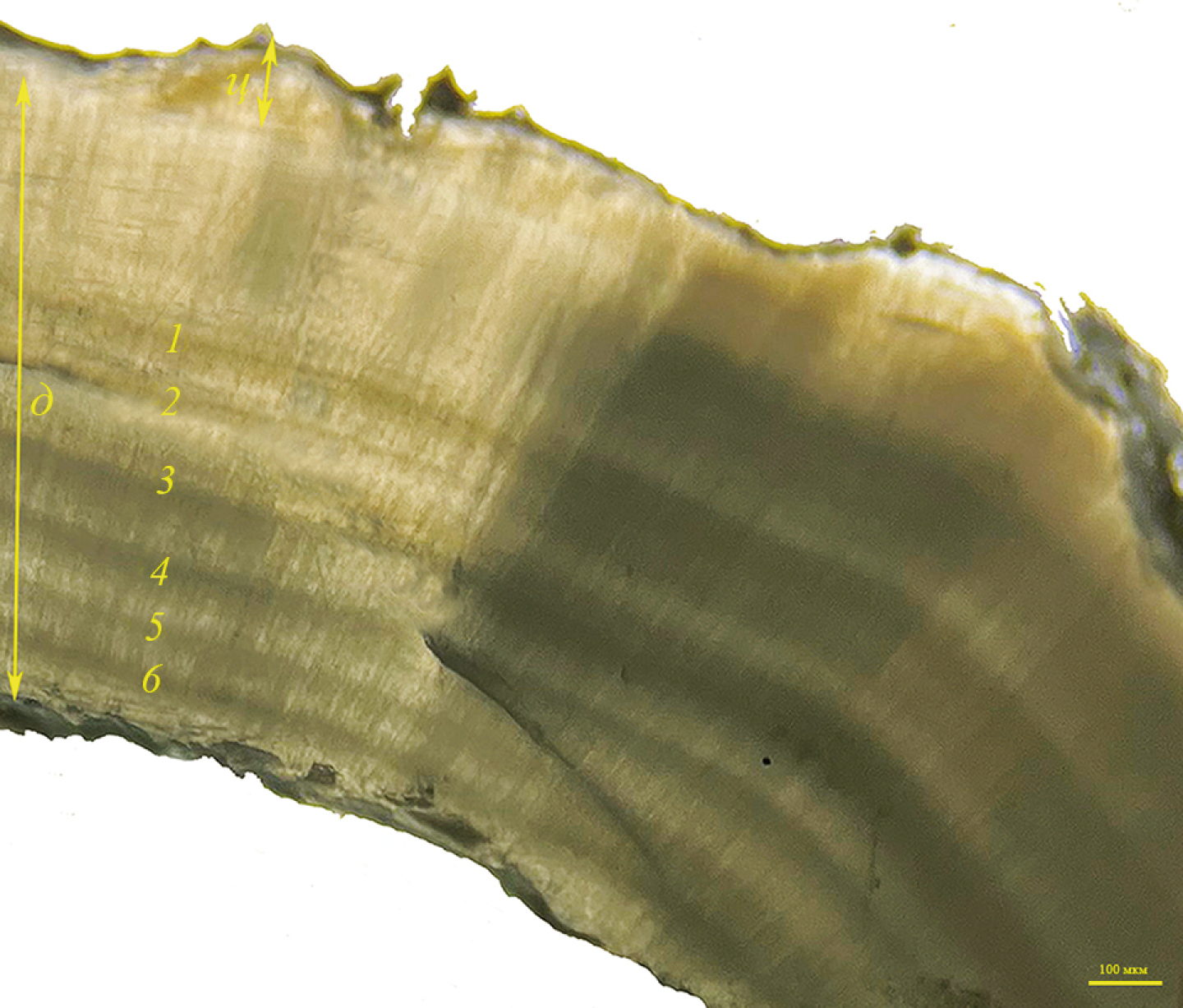 Рис. 2. Неокрашенный срез основания клыка самца байкальской нерпы (№ 10, самец, возраст 6+ лет): ц – цемент, д – дентин, 1–6 – годовые кольца дентина. Увеличение ×40.