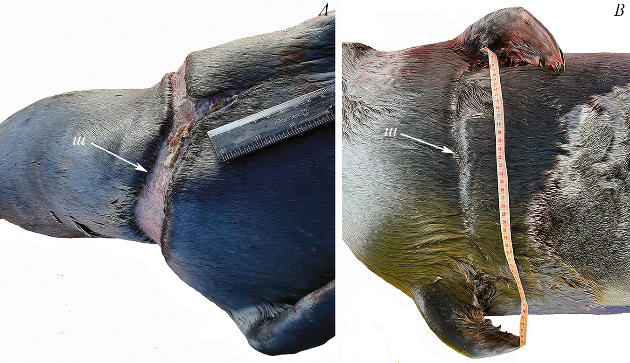 У двух половозрелых особей обнаружены шрамы, предположительно оставленные орудиями лова (рис. 3). У взрослой самки № 8 (табл. 1, рис. 3A) имелись глубокие повреждения кожи (в том числе и гиподермы) – шрамы, опоясывающие голову, грудь и шею, полученные нерпой явно от продолжительного пребывания в сетях, скорее всего нерпичьих. У зверя присутствовали признаки кахексии (истощения). При массе тела 29 кг (минимальное значение для половозрелых животных) толщина жира на груди составляла 2 см. На теле взрослой самки № 12 (табл. 1, рис. 3B) присутствовал линейный шрам, идущий поперечно по вентральной поверхности грудной клетки на уровне плечевых суставов. Шрам возник предположительно при давнем касательном пулевом ранении. Наибольший интерес представляли повреждения кожи, не являющиеся последствием воздействия человека.