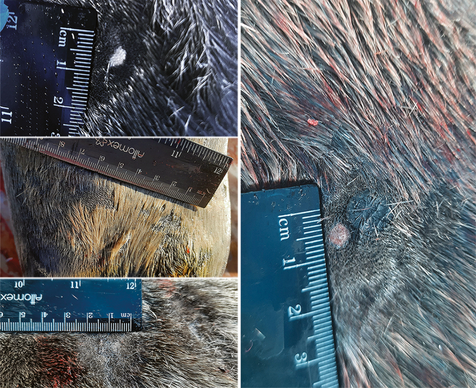 В 2021 г. у всех добытых байкальских нерп отмечены участки повреждений неправильной формы на теле, ластах и голове, на них часто отсутствовали волосы и пигментация. Участки были с неровными краями, их размер колебался от 1 мм до 3 см (рис. 4). Наибольшее количество кожных патологий обнаружено на ластах, а также в области крестца на теле животных. На коже всех особей в большом количестве обитали вши (Echinophthirius horridus baicalensis Olfers 1816). Среди нерп, добытых в 2022 г., только у одной особи на ластах имелись небольшие участки поврежденной кожи (табл. 1, № 10) и количество эктопаразитов на теле было значительно меньше в сравнении с нерпами добытыми в предыдущем году.