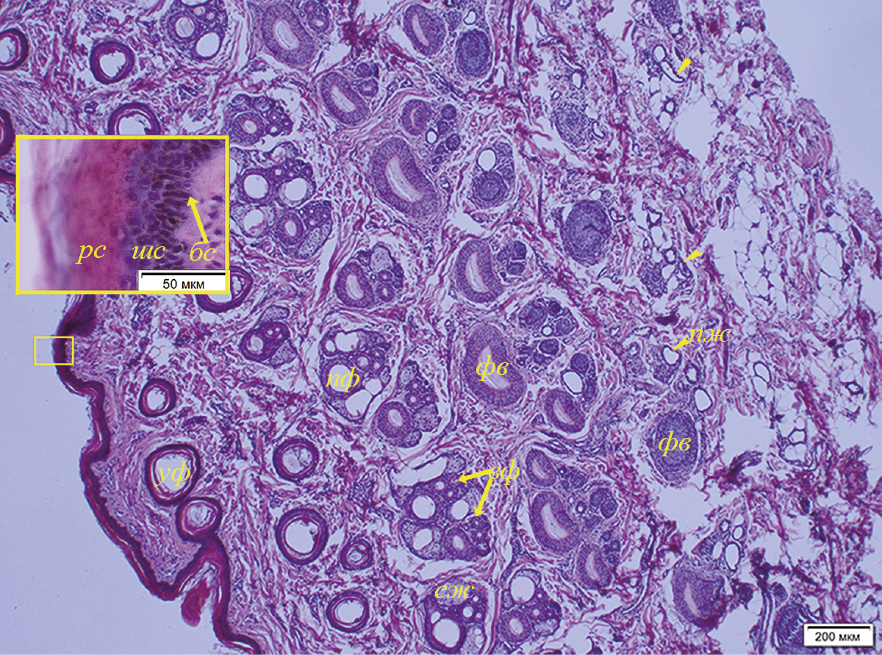 Рис. 5. Тангенциальное сечение кожи байкальской нерпы (№ 2, самка, 1+) в области груди: уф – устье волосяного фолликула, сж – сальная железа, пф – первичный фолликул, вф – вторичный фолликул (стрелки), фв – волосяной фолликул, пж – потовые железы (наконечники стрелок). На врезке – увеличенный участок эпителия с того же слайда, в эпителии видны гранулы пигмента: рс – роговой слой, шс – шиповатый слой, бс – базальный слой (стрелка). Окраска гематоксилином с эозином.