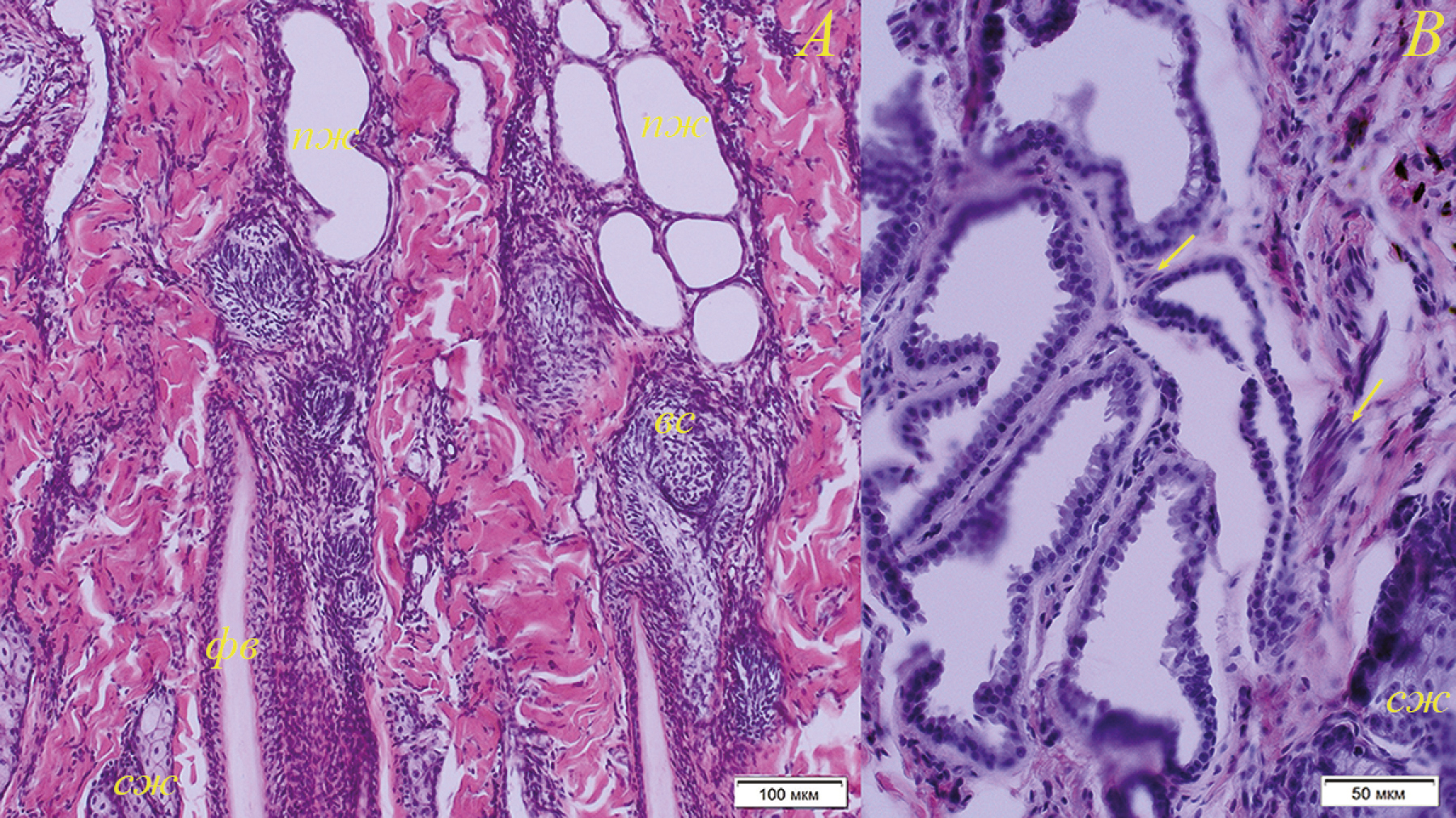 Рис. 7. Дерма (A) и потовые железы ласт (B) нерпы (№ 3, самка, 1+): фв – волосяной фолликул, сж – сальная железа, вс – волосяной сосочек, пж – потовая железа, стрелки указывают на гладкомышечные клетки. Окраска гематоксилином с эозином.
