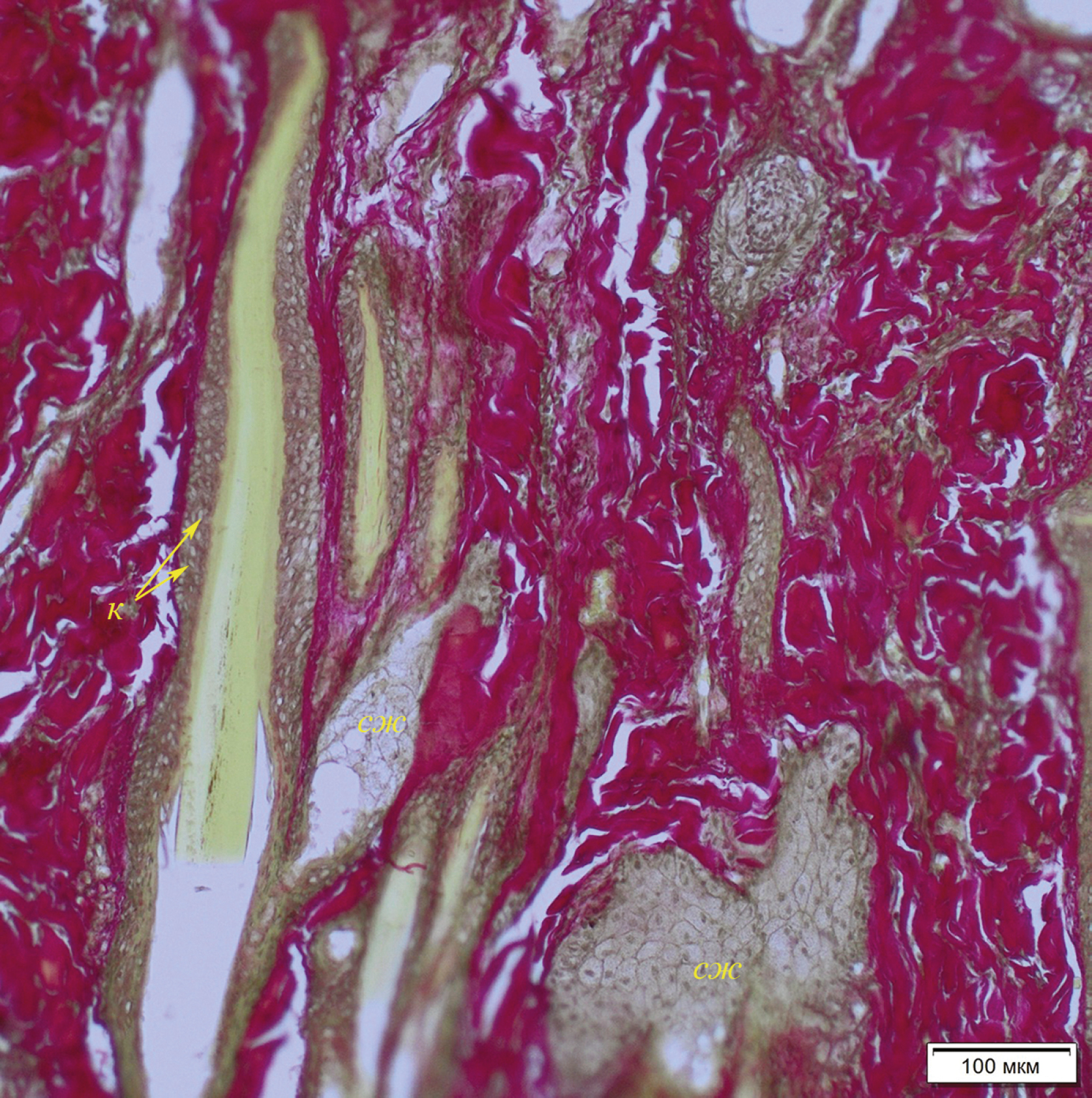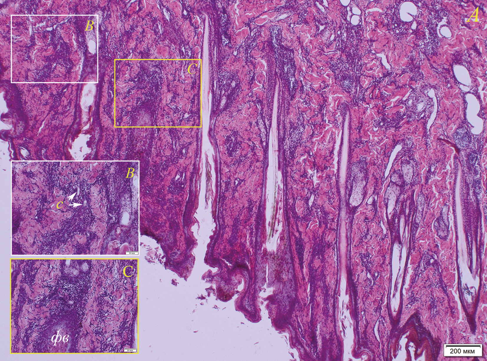 Рис. 6. Складки эпителия байкальской нерпы в коже туловища (A) (№ 2, самка, 1+) и ласт (B, С) (№ 5, самка, 2+): гс – грибовидные складки, ос – округлые складки, чс – чешуйчатые складки. Окраска гематоксилином с эозином (A, B), окраска Вейгерт – Ван Гизон (С).
