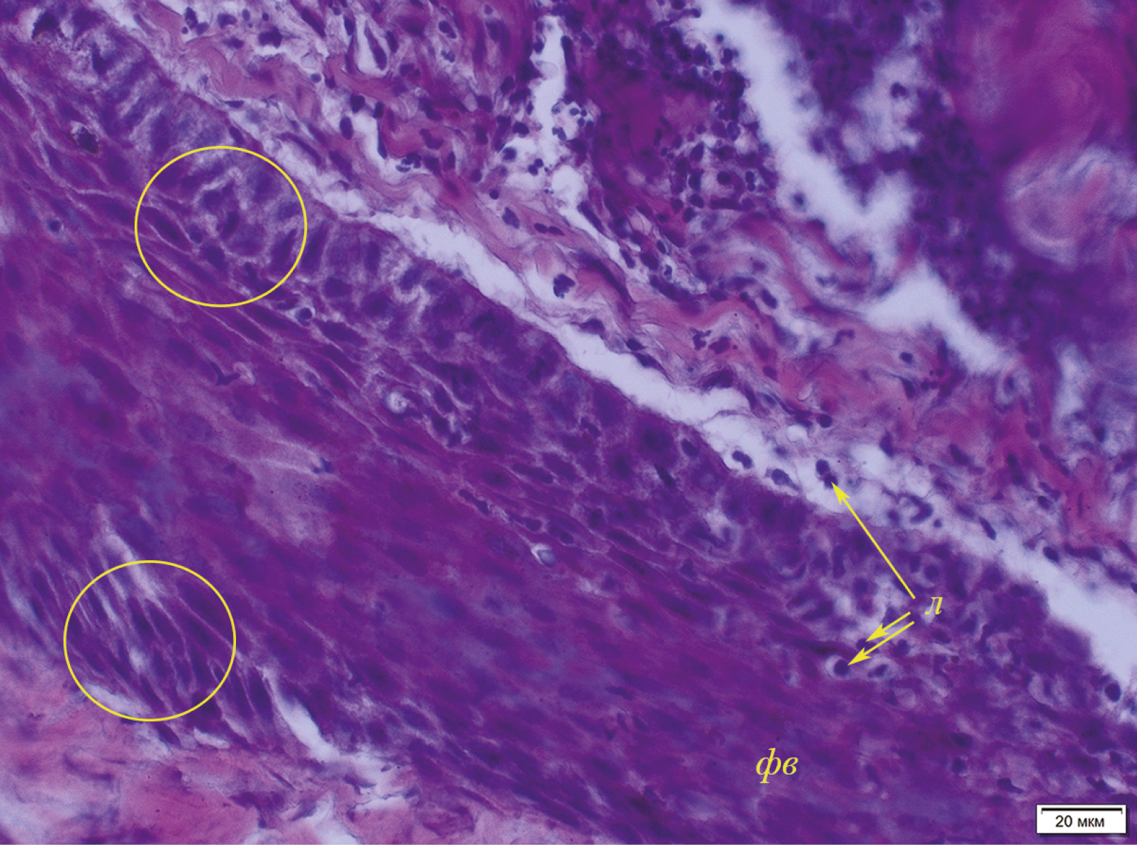 Микроскопическое исследование пораженной кожи байкальской нерпы показало наличие двух видов изменений. Первый сопровождался явлениями койлоцитоза, обнаруженными в эпидермисе, а не в слизистых оболочках, как у дельфинов (см. ниже), при этом признаки воспаления в поврежденном эпителии отсутствовали. Воспалительный инфильтрат присутствовал субэпидермально вокруг кровеносных сосудов и волосяных фолликулов, и его количество увеличивалось в глубине дермы, например в ластах на уровне расположения потовых желез. В связи с этим мы не имеем доказательств прямого воздействия патогена вирусной природы на кожу нерпы. В то же время состав воспалительного инфильтрата (преобладают лимфоциты с небольшим количеством гистиоцитов) свидетельствует об ответной реакции на патоген, который имеет вирусную природу. Не исключено, что данные патологические изменения связаны с воздействием нескольких патогенов, действие которых происходило в разное время.