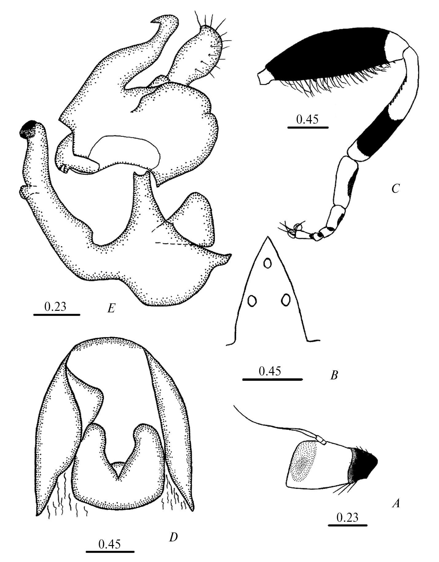 Рис. 2. Eumerus acuticornis Sack: A – педицел и постпедицел усика, B – глазковый треугольник сверху, C – задняя нога, D – вершина брюшка снизу, E – гениталии самца. Размеры приведены в миллиметрах.