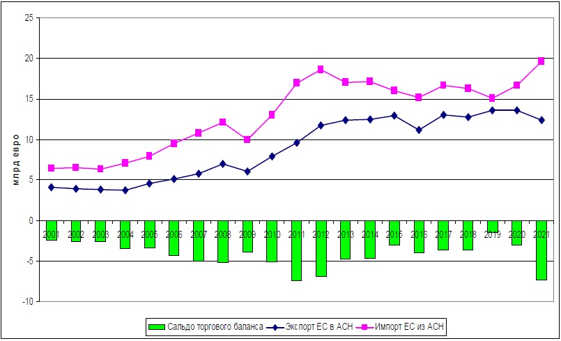 Как показывает анализ статистических данных по торговле, товарооборот ЕС со странами CAN за 20-летний период увеличился в три раза — с 10,49 млрд до 32 млрд евро. Для торговли характерно устойчивое отрицательное сальдо торгового баланса для ЕС (см. график 3). По итогам 2021 г. экспорт ЕС в CAN снизился на 9%, а импорт ЕС из этого объединения увеличился на 18% по сравнению с 2020 г. Основные статьи экспорта ЕС в CAN — промышленные товары, транспортные машины и оборудование, а также химикаты. Наибольшую долю в импорте из CAN в ЕС составляют сельскохозяйственная продукция, топливо и продукция горнодобывающей промышленности.