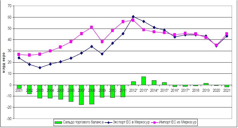 График 4. Внешняя торговля Евросоюза с Mercosur, 2001—2021 гг. (млрд евро). Источник: составлено автором на основе данных Trade Map [41].
