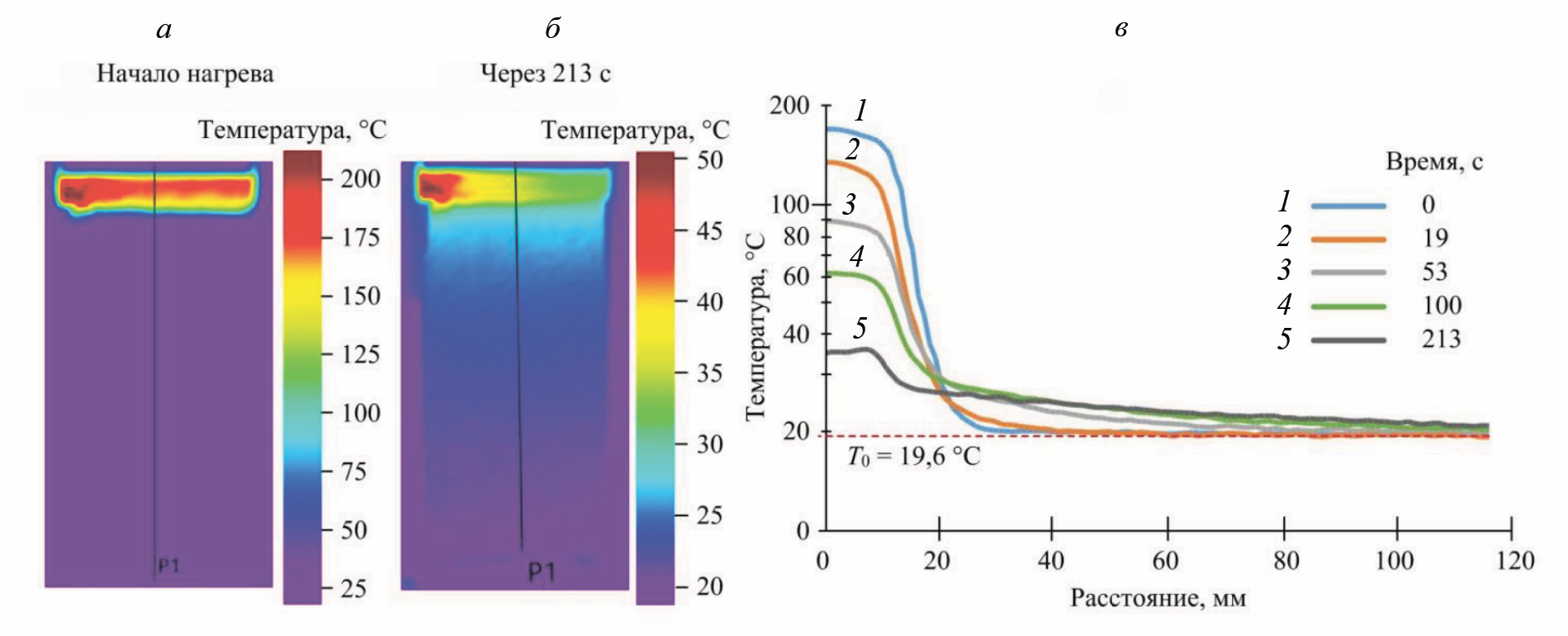 Анализ термограмм поверхности кольца (рис. 5) показывает уменьшение температуры нагревателя с 200 до 60 °С за первые 100 с. Градиент температуры прямо пропорционален тепловому потоку, который в первые 25—30 с на расстояниях больше 50 мм от нагревателя не превышает цены наименьшего разряда тепловизора 0,05 °С. Пространственное распределение температуры в начальный момент имеет прямоугольную форму и «расплывается» с течением времени со скоростью не более 1,5 мм/с.