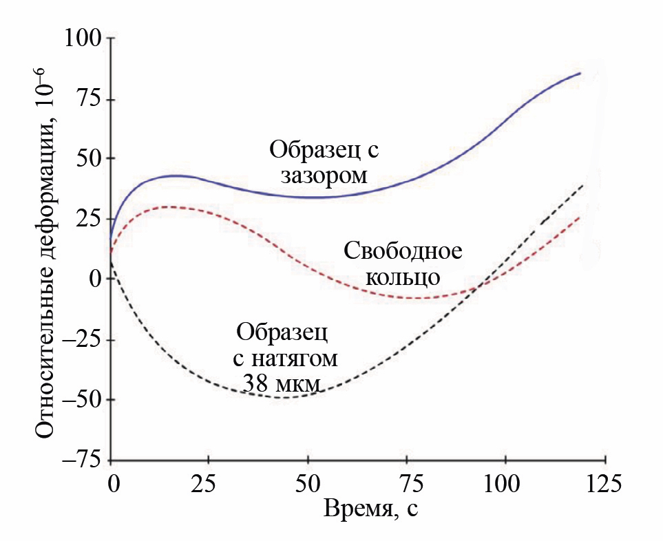 Рис. 6. Временные зависимости деформаций кольца подшипника, измеренные датчиком поз. 2 рис. 3б, при испытаниях свободного кольца, образца без натяга и образца с натягами.