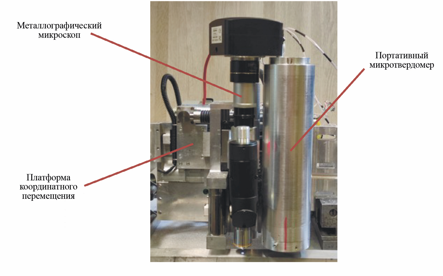 Исследовательский блок представляет собой платформу, на которой установлены металлографический микроскоп и портативный микротвердомер (рис. 4). Как и блок подготовки поверхности, платформа имеет программное управление и обеспечивает координатное перемещение установленных на ней устройств по трем осям с точностью до 1 мкм.