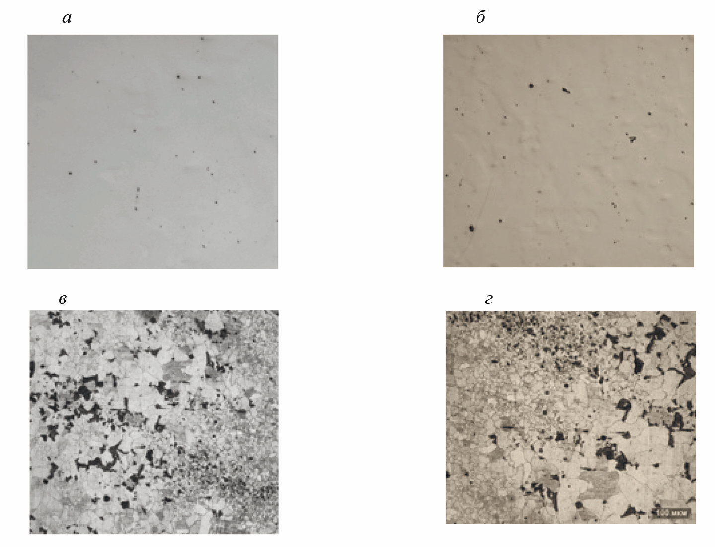 а, в — соответственно изображение нетравленой и травленой поверхности, полученное на микроскопе диагностического комплекса MicroLab-Z2; б, г — соответственно изображение нетравленой и травленой поверхности, полученное на стационарном микроскопе
