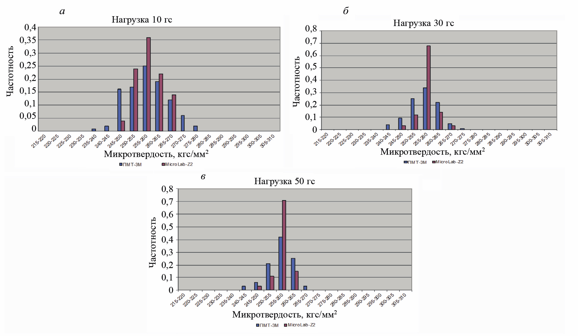 Выполнялось по 30 измерений при нагрузках в 10, 30 и 50 гс.