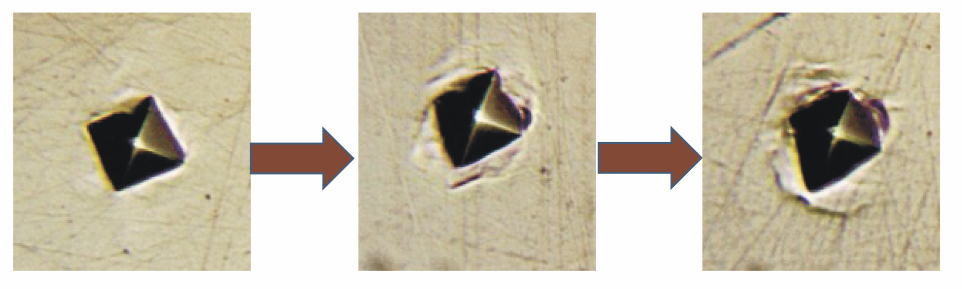 - оценка степени охрупчивания металла. Для пластичных металлов (сталей) степень охрупчивания определяется по специально разработанной методике [22]: по результатам анализа морфологии локализованных сдвигов рядом с отпечатком при микроиндентировании (рис. 7). Данный эффект отражает влияние различных видов упрочнения металла (дислокационного, зернограничного, дисперсного, твердорастворного) на механизм его пластической деформации: переход от однородной пластической деформации к локализованной и последующему разрушению. Для хрупких материалов степень охрупчивания может оцениваться по различным существующим методикам обработки длины, количества, морфологии трещин рядом с отпечатком, по нагрузке, приводящей к трещинообразованию, и т.д. [23—28];