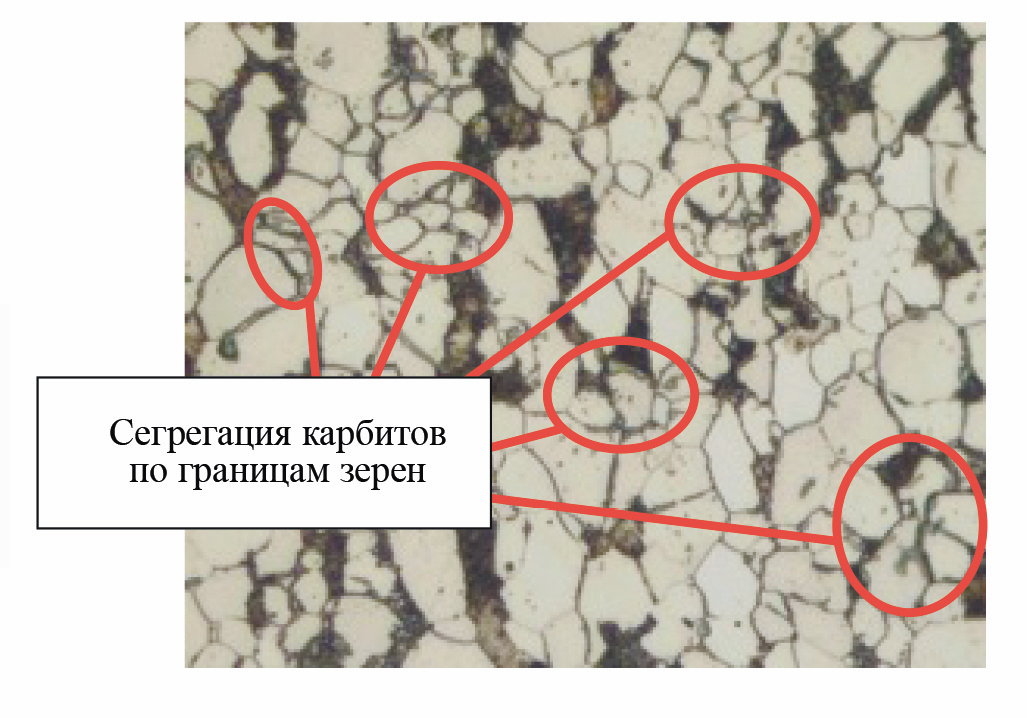 - оценка протекания процессов старения металла. Может быть выполнена в ходе металлографического анализа структуры металла, по появлению характерных выделений на границах зерен (рис. 8) или более точно: по снижению значений микротвердости соответствующих структурных составляющих в анализируемом состоянии металла конструкции относительно базового [29].