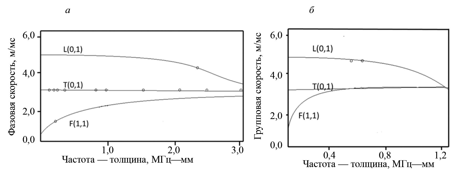Таблица 4. Скорости волн мод L(0, 1), T(0, 1) и F(1, 1) при различных длинах L волновода, м/с