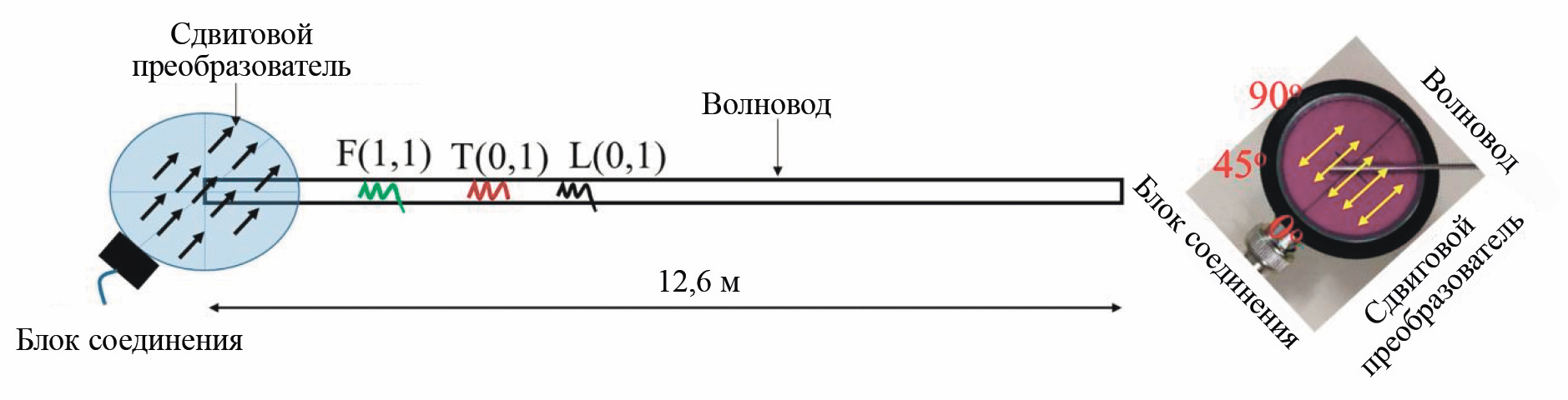 Рис. 2. Ориентация волновода и датчика под углом 45° для распространения мод F(1,1), T(0,1) и L(0,1) в эксперименте и фото возбуждения мод