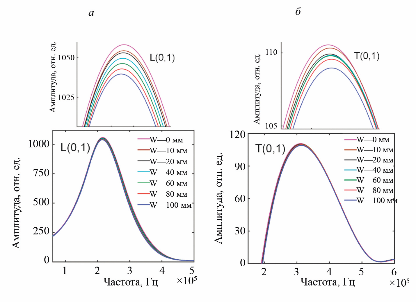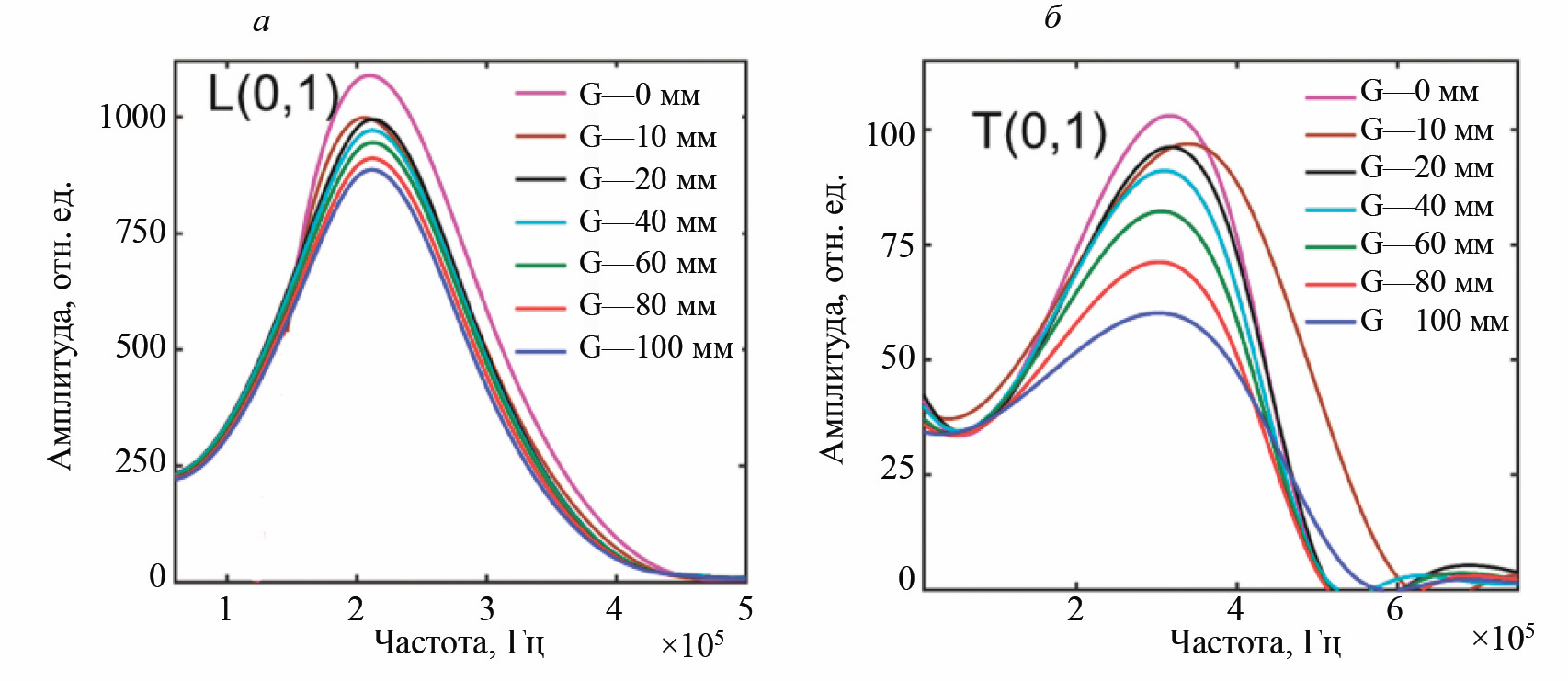 Рис. 7. БПФ для полученных мод L(0, 1) (а), T(0, 1) (б) сигналов от воды