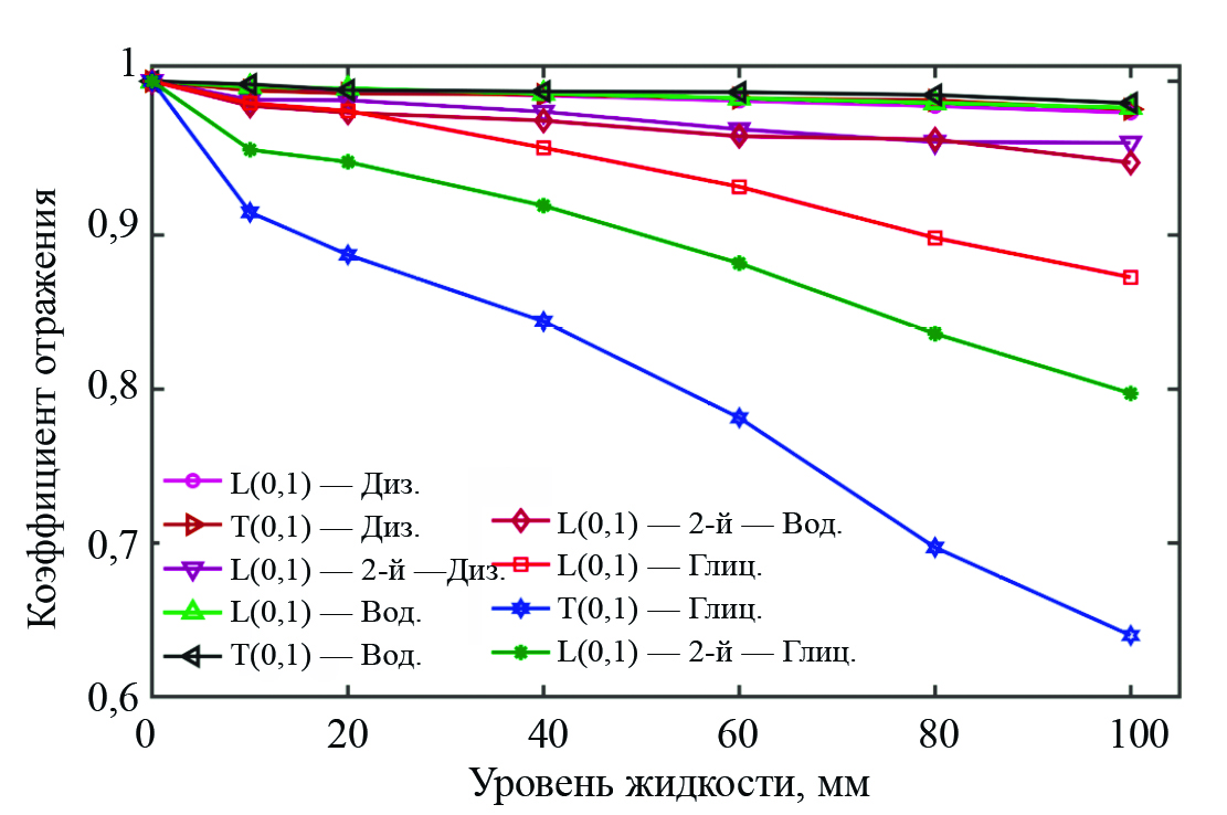 Волноводный датчик был откалиброван по коэффициенту отражения, полученному в результате анализа в частотной области на основе падения амплитуды. Коэффициент отражения (КО) имеет решающее значение для исследования свойств жидкости, таких как уровень, вязкость и плотность [11, 18, 21]. Коэффициент отражения — это отношение амплитуды отраженного сигнала в жидкой среде к амплитуде сигнала в воздушной среде. Как показано на рис. 6 и рис. 8, в густой жидкости (глицерин) наблюдается более значительное снижение амплитуды и большее уменьшение коэффициента отражения (КО) из-за высокого затухания. Однако в текучих жидкостях (дизельное топливо или вода) наблюдалось незначительное снижение амплитуды и меньшее уменьшение КО вследствие меньшего затухания, как показано на рис. 7 и рис. 8. Коэффициент отражения (КО) мод L(0, 1) и T(0, 1) был измерен путем анализа падения амплитуды полученного сигнала при различных уровнях погружения. Кроме того, из-за большей чувствительности для измерения уровня жидкости был использован сигнал второго прохождения моды L(0, 1) [20], хотя результаты измерений уровня жидких сред (дизельное топливо, вода) оказались неудовлетворительными. Особенно чувствительность мод L(0,1) была ниже в прямых волноводах [21, 22] при измерении уровня жидкости на малой глубине. Следовательно, длинный прямой волновод может быть преобразован в датчик с изогнутым или спиральным волноводом [18, 20] для эффективного измерения текучей среды при микроизменениях уровня (≤ 0,5 мм) благодаря высокой чувствительности, несмотря на то, что моды L и T могут измерять большую глубину/уровень жидкости из-за постепенного падения [20] КО сигнала при заполнении больших глубин и типов жидкостей. Падение/затухание амплитуды сигнала датчика происходит на границе волновода (твердой среды) и жидкой среды из-за несоответствия импеданса между ними. Как правило, в текучих жидкостях потери (затухание) волн были меньше из-за низкой вязкости или меньшего затухания. Однако в густых жидкостях возникает большее затухание волн из-за большего демпфирования (высокой вязкости). Следовательно, ослабление/падение амплитуды сигнала датчика прямо пропорционально вязкости жидкости. Однако чувствительность датчика хорошо объясняется на основе коэффициента отражения при использовании различных жидкостей в ранних работах [18, 20].