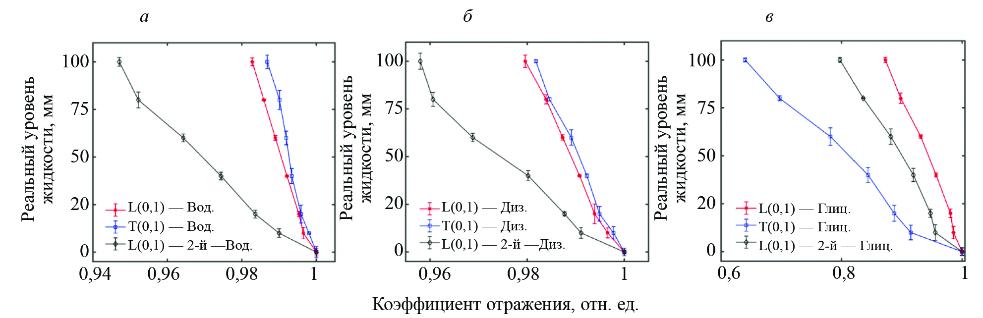 Рис. 9. Границы погрешности для L(0,1), T(0,1) 1-го прохода и L(0,1) 2-го прохода в воде (a); дизельном топливе (б); глицерине (в)