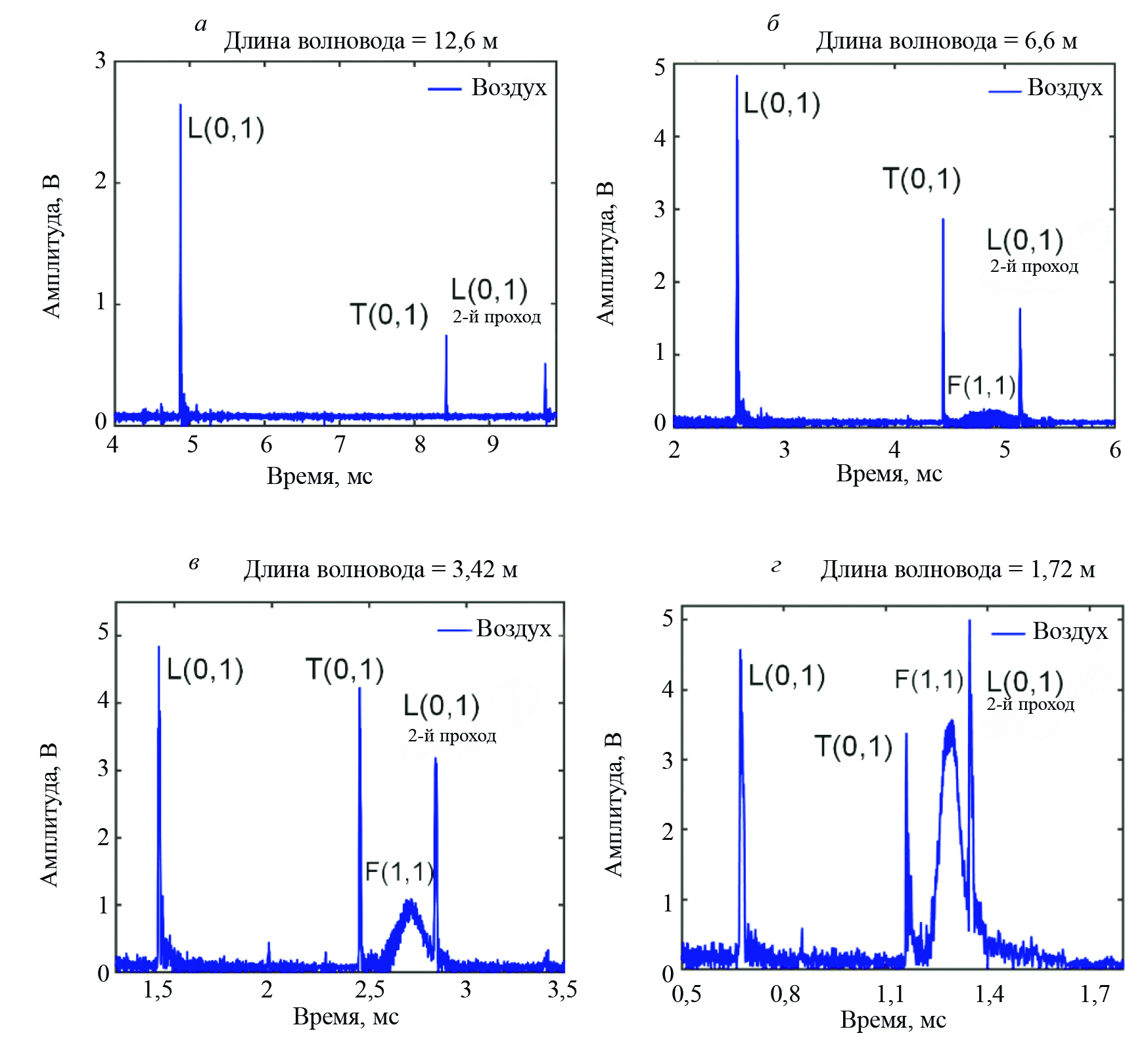 При разработке длинного датчика был исследован эффект затухания в длинном волноводе из нержавеющей стали путем проведения экспериментов с использованием всех трех мод волны. В этом эксперименте было определено затухание распространения волн для трех режимов, а именно F(1, 1), T(0, 1) и L(0, 1). Для проведения исследования затухания мы рассматривали волновод начальной длины 12,6 м. Полученный сигнал А-скана включал моды L(0, 1) и T(0, 1) на длине 12,6 м, как показано на рис. 10а. После этого длинный волновод отрезали через каждые 1 м, чтобы определить эффект затухания при уменьшении длины волновода от 12,6 м. Во время этого эксперимента датчик сдвига надежно и плотно подсоединили с ориентацией 45 град [20, 35] и приложили соответствующее давление, чтобы получить все три волновые моды. Длина волновода была уменьшена (путем отрезания) с 12,6 до 1,72 м. Волновые моды F(1, 1), T(0, 1) и L(0, 1) совместно наблюдались (см. рис. 10б—г) на определенных длинах волновода (от 6,6 до 1,72 м). Амплитуды сигналов волновых мод L(0, 1) и T(0, 1) увеличивались при одновременном уменьшении длины волновода с 12,6 до 1,72 м.