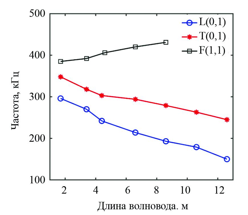 Рис. 12. Зависимость частоты сигнала L(0, 1), T(0, 1), F(1, 1) от длины волновода