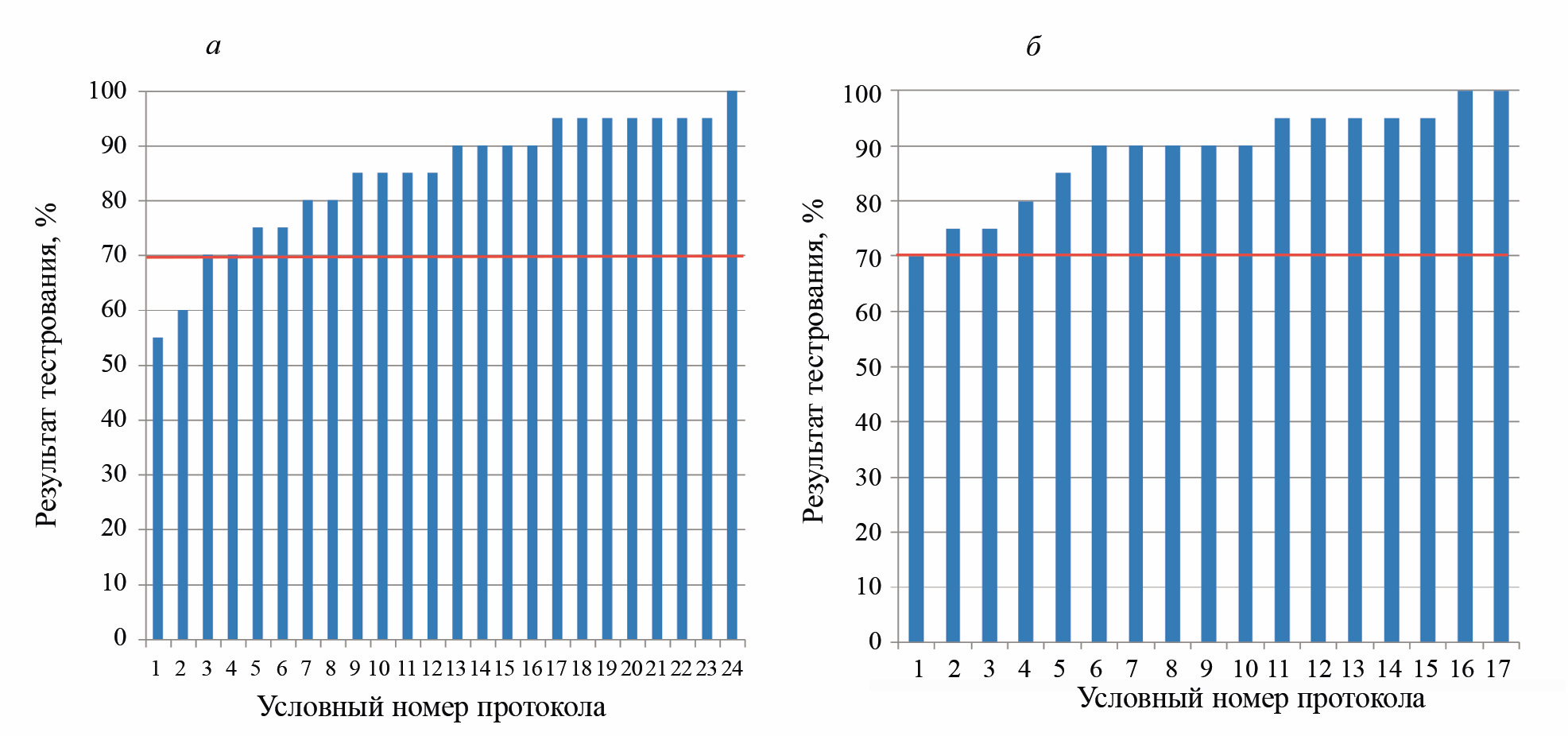 На рис. 6 представлены гистограммы результатов тестирования группы испытуемых по общему экзамену вихретокового контроля, проведенного в 2021 (а) и в 2022 гг. (б). Данные ранжированы по возрастанию результата кандидата с условным номером протокола (первый условный номер протокола присвоен специалисту с минимальным результатом тестирования). Согласно рис. 6а, в 2021 г. все 23 кандидата были допущены, из них 12 кандидатов (52 %) имели результат тестирования не ниже 90 %. Согласно рис. 6б, в 2022 г. из 15 тестируемых кандидатов 5 человек (30 %) имели результат тестирования не ниже 90 % и 1 кандидат не справился с тестом.