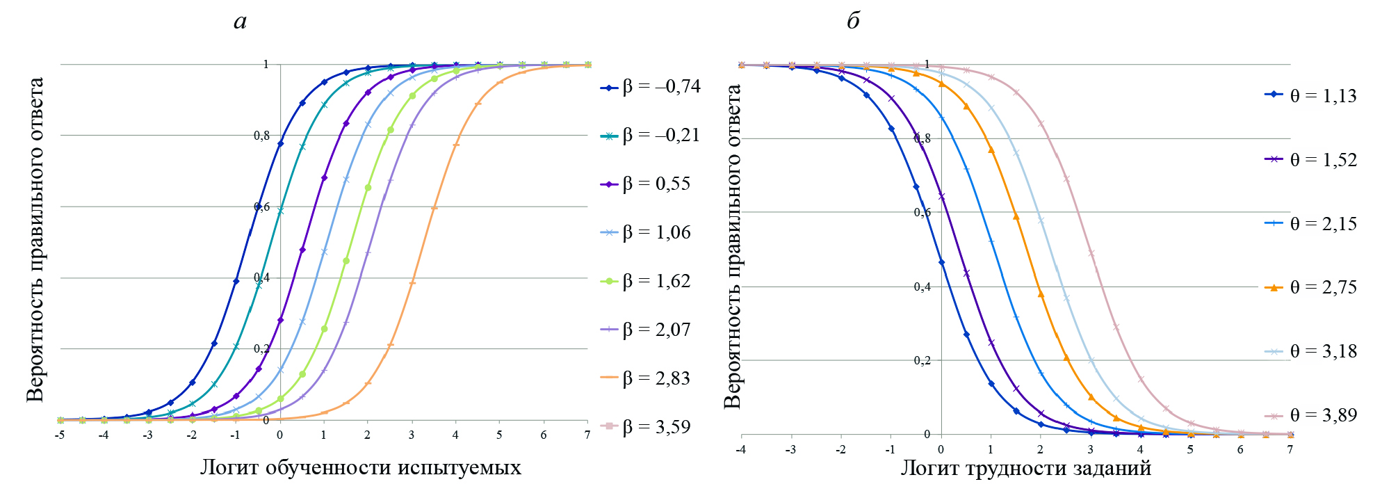 Рис. 13. Характеристические кривые тестовых заданий общего экзамена (а) и испытуемых (б)