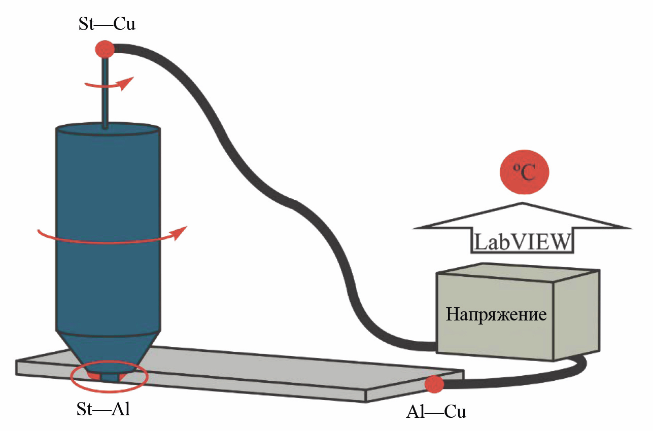 В начале 21 века во многих отраслях промышленности стала широко внедряться технология сварки трением с перемешиванием (friction stir welding (FSW)). Получаемое сварное соединение при этом имеет более высокие механические свойства по сравнению с соединением, полученным дуговой сваркой. Другими преимуществами сварки трением с перемешиванием является способность сваривать «несвариваемые» алюминиевые сплавы, а также низкая деформация свариваемых изделий. Качество сварного шва зависит от температуры сварки. Для контроля температуры сварного шва было предложено использовать термоэлектрический метод, основанный на измерении температуры термопарой, образованной соединением инструмент—заготовка [25—29]. На рис. 1 показана схема контроля температуры методом контактной пары инструмент—деталь. Сравнение трех методов контроля температуры в процессе сварки трением с перемешиванием: термопарой, встроенной в инструмент, термопарой, встроенной в заготовку, и термопарой, образованной соединением инструмент—заготовка, показало преимущества метода, основанного на контактной паре инструмент—деталь [28]. При таком подходе время реакции термопары на изменение температуры существенно сокращается, кроме того, увеличивается точность измерения температуры т.к. термопара расположена в самом сварном соединении [24]. Авторы исследовали влияние тепловыделения, вызванного теплопроводностью подложки, на температуру сварного шва и реакцию терморегулятора на нее. Было выявлено сильное влияние рассеивания тепла, вызванного геометрическими особенностями и окружающей средой, на конечное качество сварного шва. При этом определялась скорость охлаждения сварного шва, исследовалась структура сварного шва по макрофотографии и проводились испытания на растяжение.