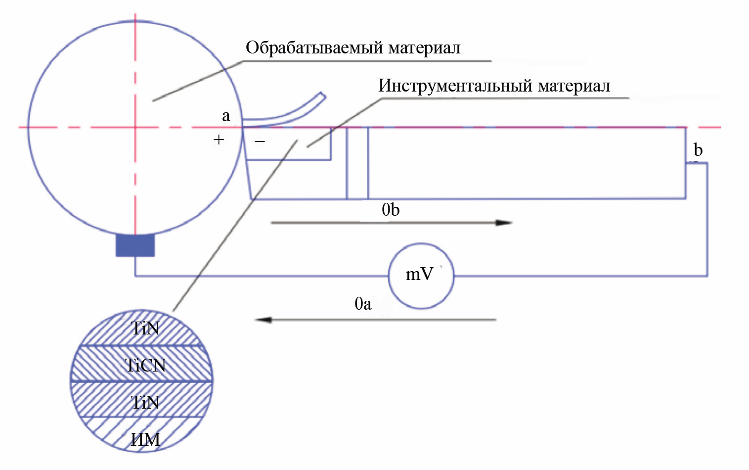 В последние двадцать лет интенсивно стало развиваться направление по контролю режимов работы режущего инструмента при токарной обработке металлических изделий стружкообразующим способом. Такой контроль позволяет существенно повысить стабильность и качество обработки, а также экономическую эффективность производства. Для этого необходим мониторинг температурного режима контактной пары режущий инструмент—заготовка. Было предложено использовать сигнал термоЭДС в естественной термопаре инструмент—заготовка [33, 34]. Термопара образована обрабатываемым материалом, обозначенным «а», и материалом, из которого изготовлен инструмент, обозначенным «b» (рис. 4). Спаи полученной термопары находятся при температурах θа и θb.