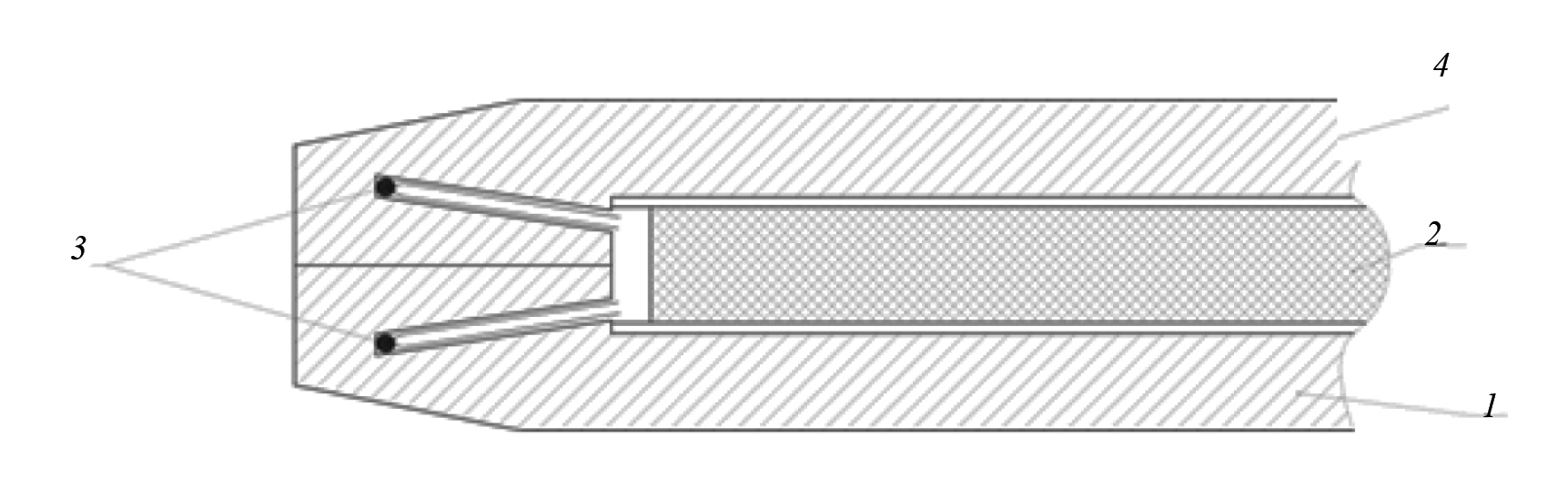 Рис. 5. Конструкция датчика: 1 — первый горячий электрод; 2 — нагревательный элемент; 3 — термопары; 4 — второй горячий электрод
