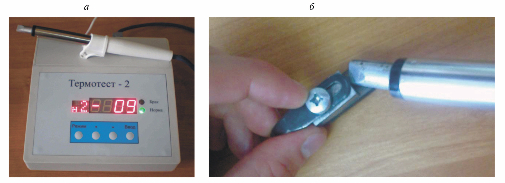 Рис. 6. Прибор термоэлектрического контроля с дифференциальным датчиком «ТЕРМОТЕСТ»: а — блок электроники; б — дифференциальный датчик с эталоном и тестируемым образцом