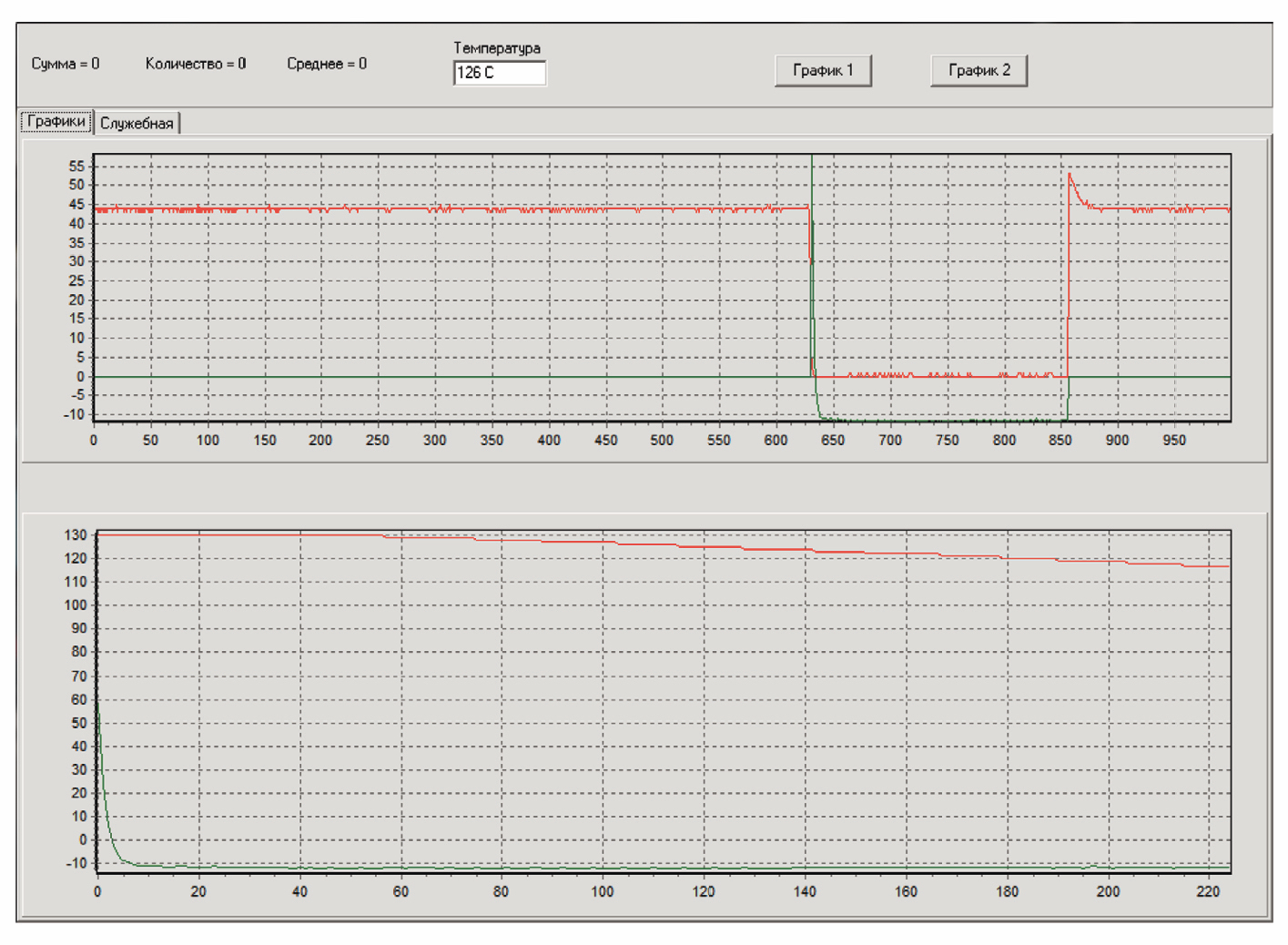 В верхнем окне отображается данные, поступающие в персональный компьютер после включения прибора. Данные о величине термоЭДС закодированы зеленым цветом, а данные о величине контактного сопротивления — красным цветом. При разомкнутой измерительной цепи (отсутствие контакта горячего электрода с тестируемым объектом) контактное сопротивление велико, красная линия отображается на уровне 44 единиц, что соответствует переполнению аналого-цифрового преобразователя. При замыкании измерительной цепи контактное сопротивление между горячим и холодным электродами уменьшается до нуля. Это произошло в момент времени 6,3 с (630 по шкале абсцисс). При этом значение термоЭДС составило –12 мкВ. Через 2,3 с процесс измерения термоЭДС завершен (момент времени 860 по шкале абсцисс), измерительная цепь разомкнулась и контактное сопротивление вернулось к первоначальному значению 44, а термоЭДС стала равна нулю.
