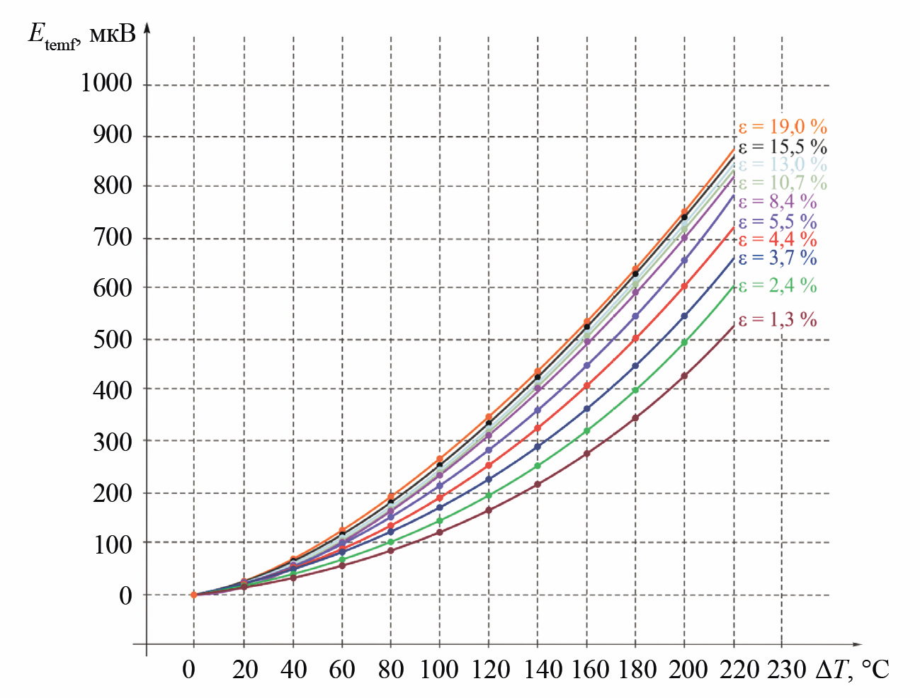 Рис. 8. Зависимость термоЭДС от температуры горячего электрода из меди для различной степени пластической деформации (ε) стальной проволоки диаметром ≈2,8 мм, изготовленной из нержавеющей стали X5CrNi1810 [45]