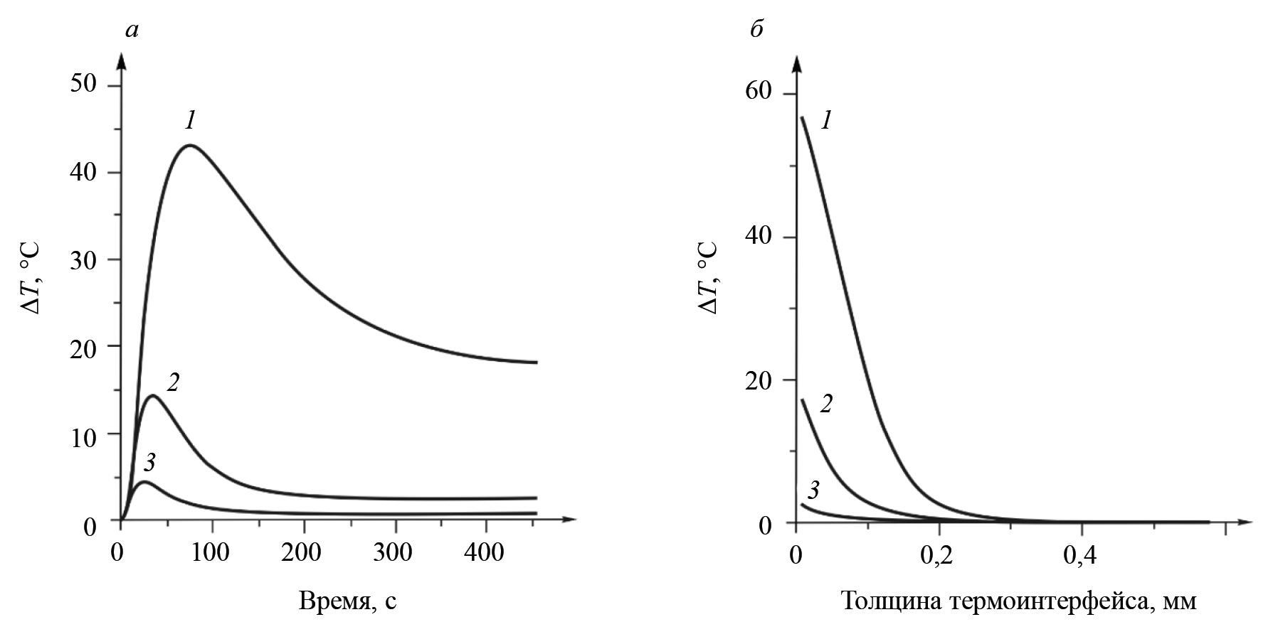 Рис. 12. Зависимость разницы температур от времени (а) и толщины термопасты (б): 1 — удельная теплопроводность термопасты в 10 раз больше номинальной; 2 — номинальная удельная теплопроводность; 3 — удельная теплопроводность термопасты в 10 раз меньше номинальной