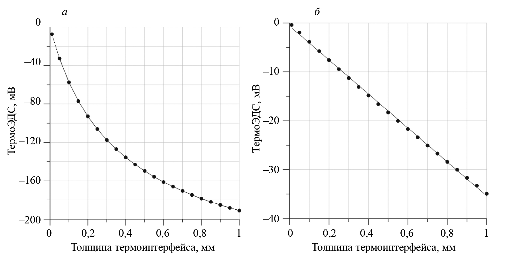 Рис. 13. Зависимость термоЭДС от толщины слоя термоинтерфейса: а — переходной режим; б — установившийся режим