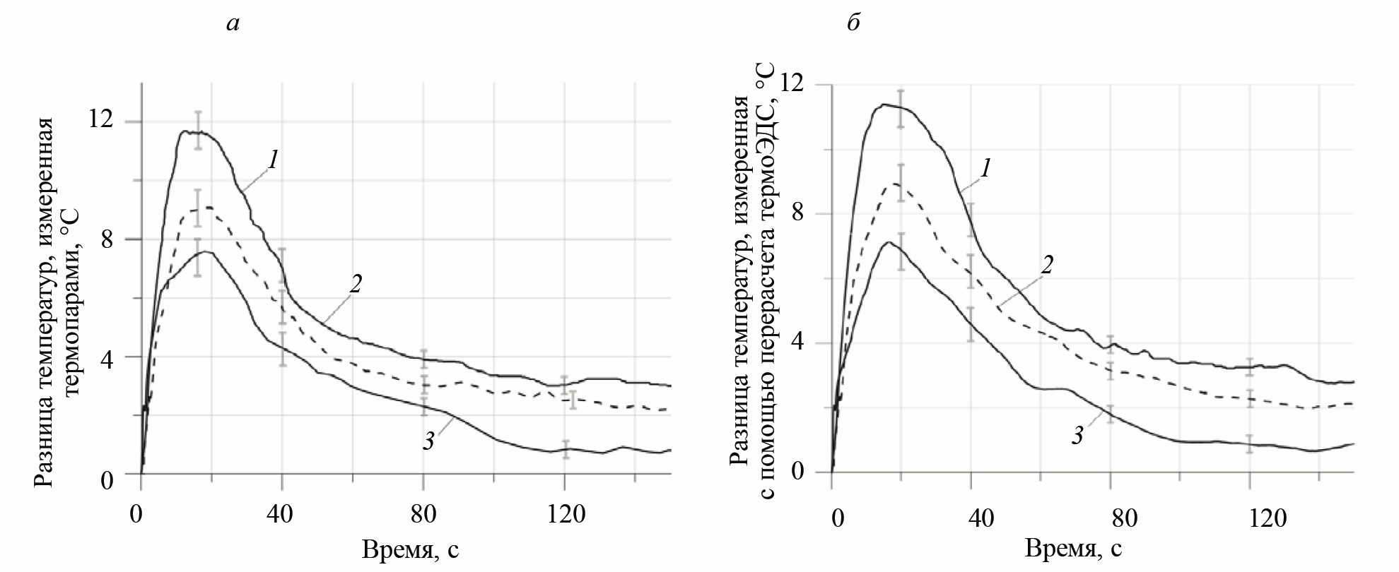 Рис. 14. Зависимость разницы температур корпуса силового прибора и радиатора охлаждения от времени, полученные с помощью термопар (а) и с помощью пересчета термоЭДС (б): 1 — без термоинтерфейса; 2 — с частично нанесенным термоинтерфейсом (50 %); 3 — с нанесенным термоинтерфейсом
