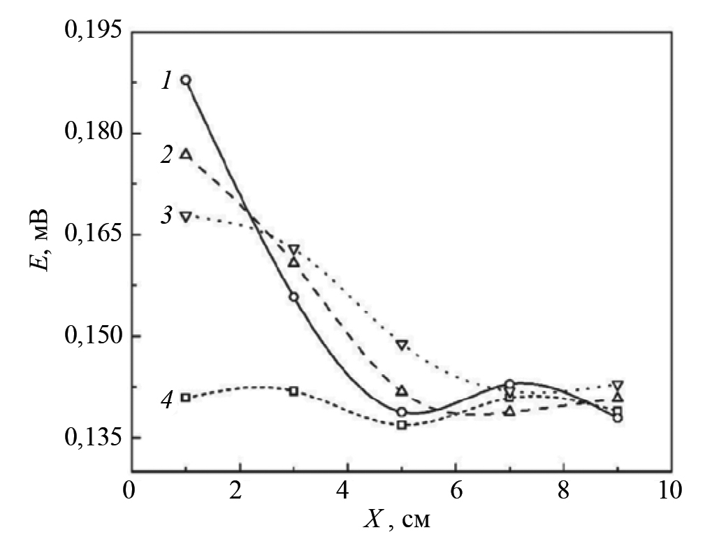 Из рис. 18 видно, что термоЭДС уменьшается во времени. Так, через 5 ч после наводораживания термоЭДС в координате «1» составила 187 мВ, через 30 ч — уменьшилась до 175 мВ и через 75 ч — уменьшилась до 168 мВ. По этим данным можно судить о миграционных процессах водорода в титановых сплавах и использовать для целей неразрушающего контроля материалов. Кроме того, наблюдается неравномерное распределение термоЭДС по длине образца, что говорит о неравномерном наводораживании исследуемого образца.