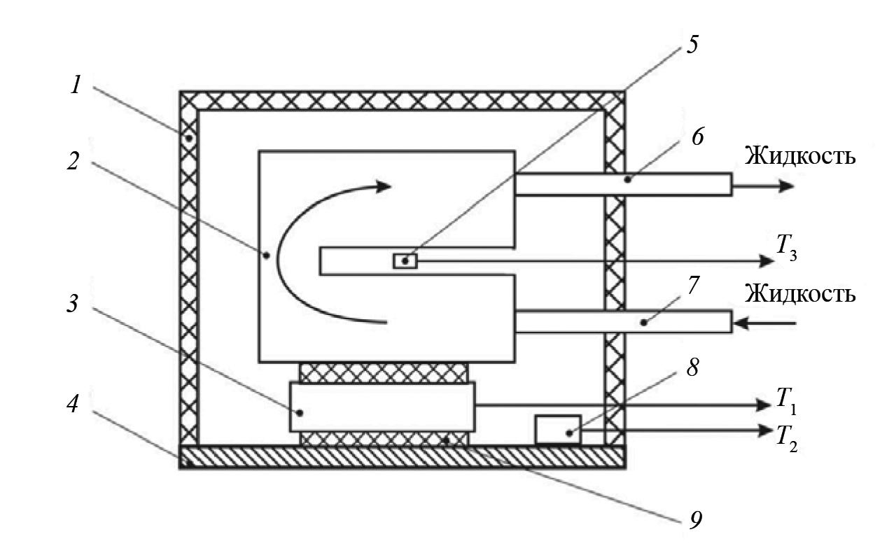 Рис. 19. Конструкция термоэлектрического датчика температуры и теплового потока: 1 — эбонитовая изоляционная оболочка; 2 — медный жидкостный радиатор (15×15×6 мм); 3 — термоэлектрический сенсор (10×10×2,4 мм); 4 — медное основание датчика (thickness 0,3 мм); 5 — датчик температуры медного радиатора T3; 6, 7 — впускной и выпускной патрубки (∅ 4 мм); 8 — датчик температуры медной основы T2; 9 — слой теплопроводящей пасты [64]