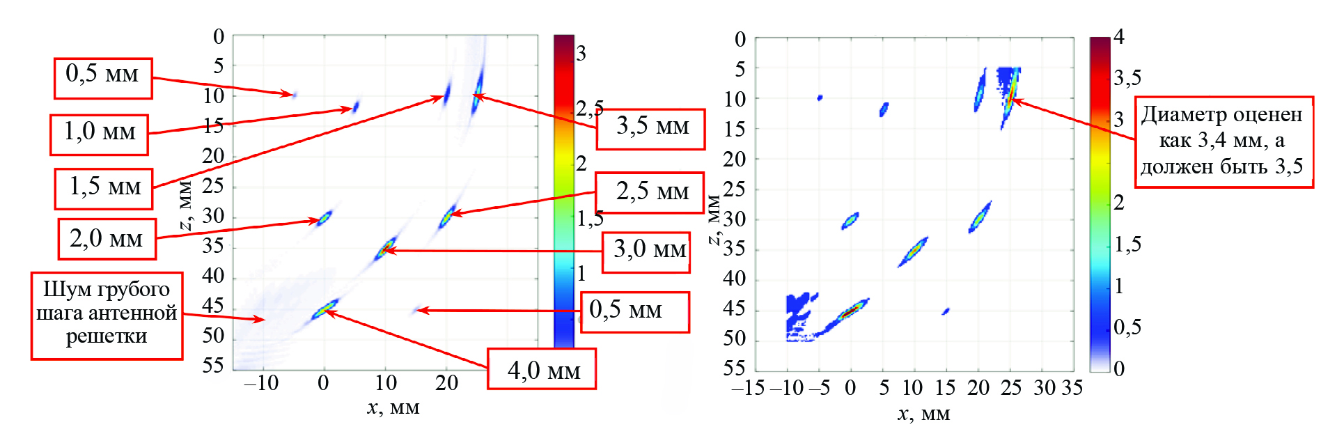 На рис. 1б показано АРД-изображение как диаметр эквивалентного ПДО d(xi, zi). Цветовая шкала справа от растрового изображения соответствует диаметру ПДО от 0 до 4 мм. Все диаметры эквивалентных ПДО совпали с заданными при расчете в CIVA диаметрами ПДО с точностью ±0,1 мм, за исключением ПДО диаметром 3,5 мм в точке (25, 10) мм — его эквивалентный диаметр получился равным 3,4 мм.